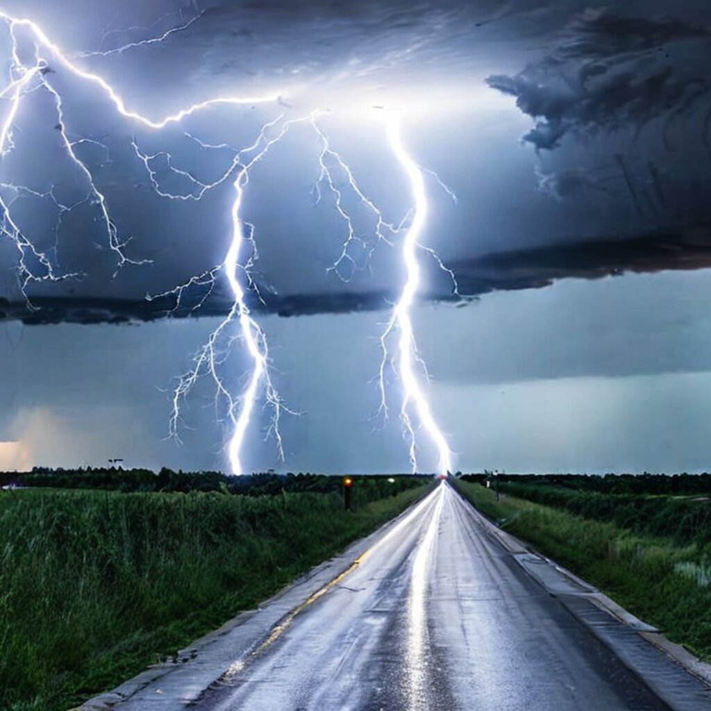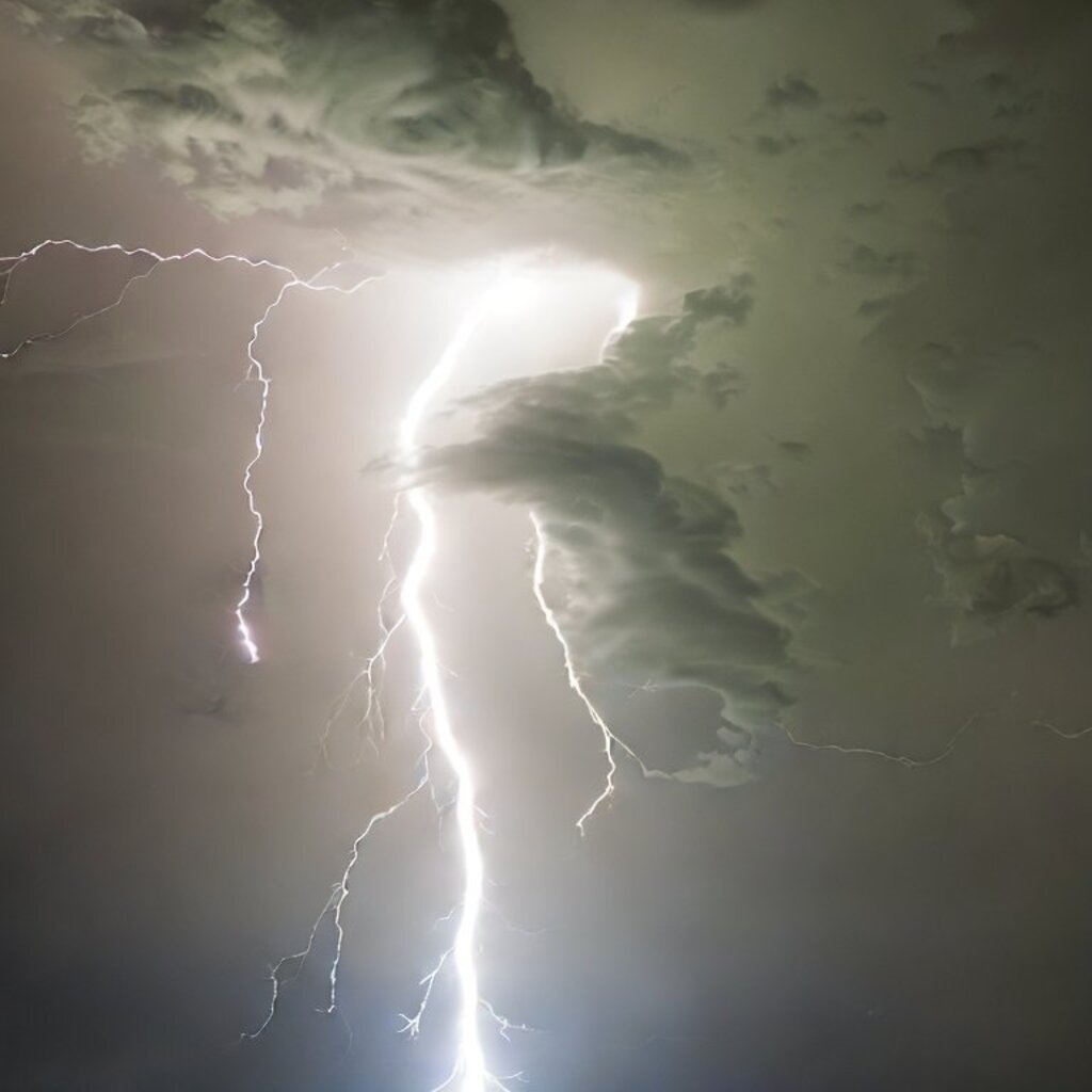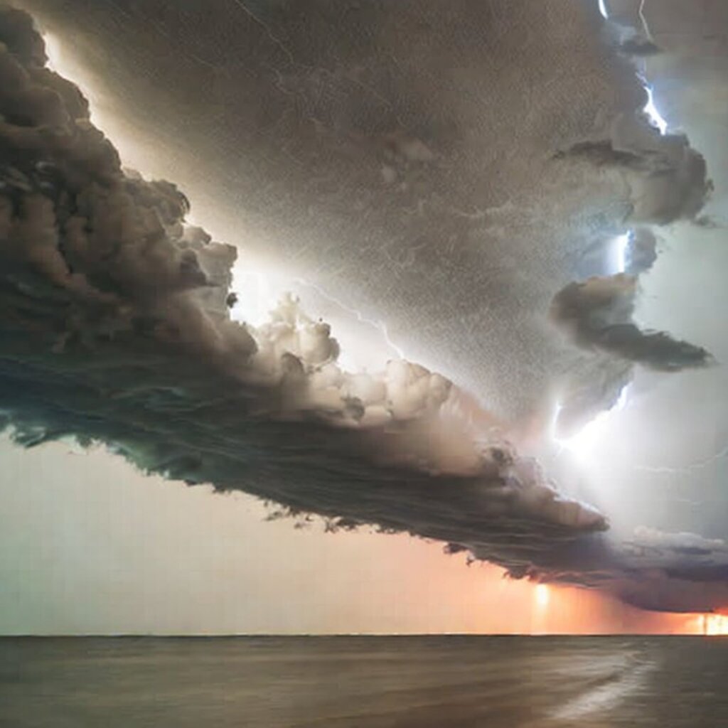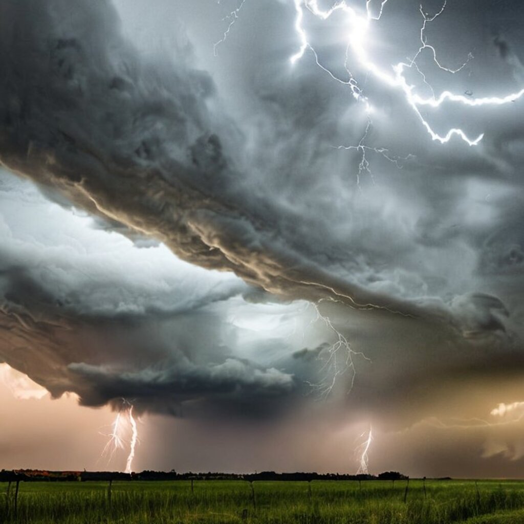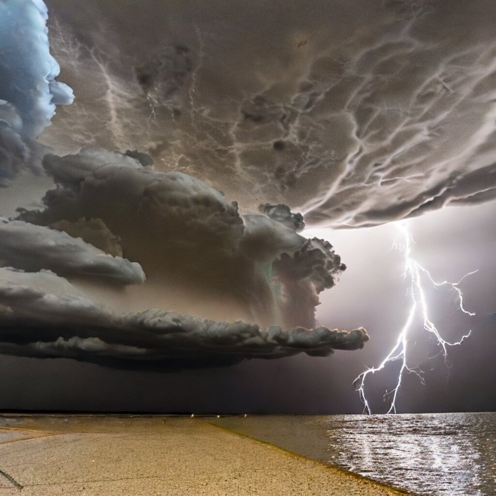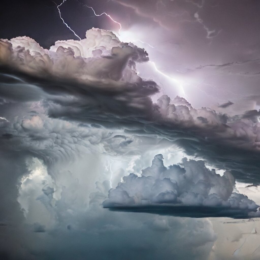 huge thunderstorm clouds like a tunnel, dramatic light, lightning