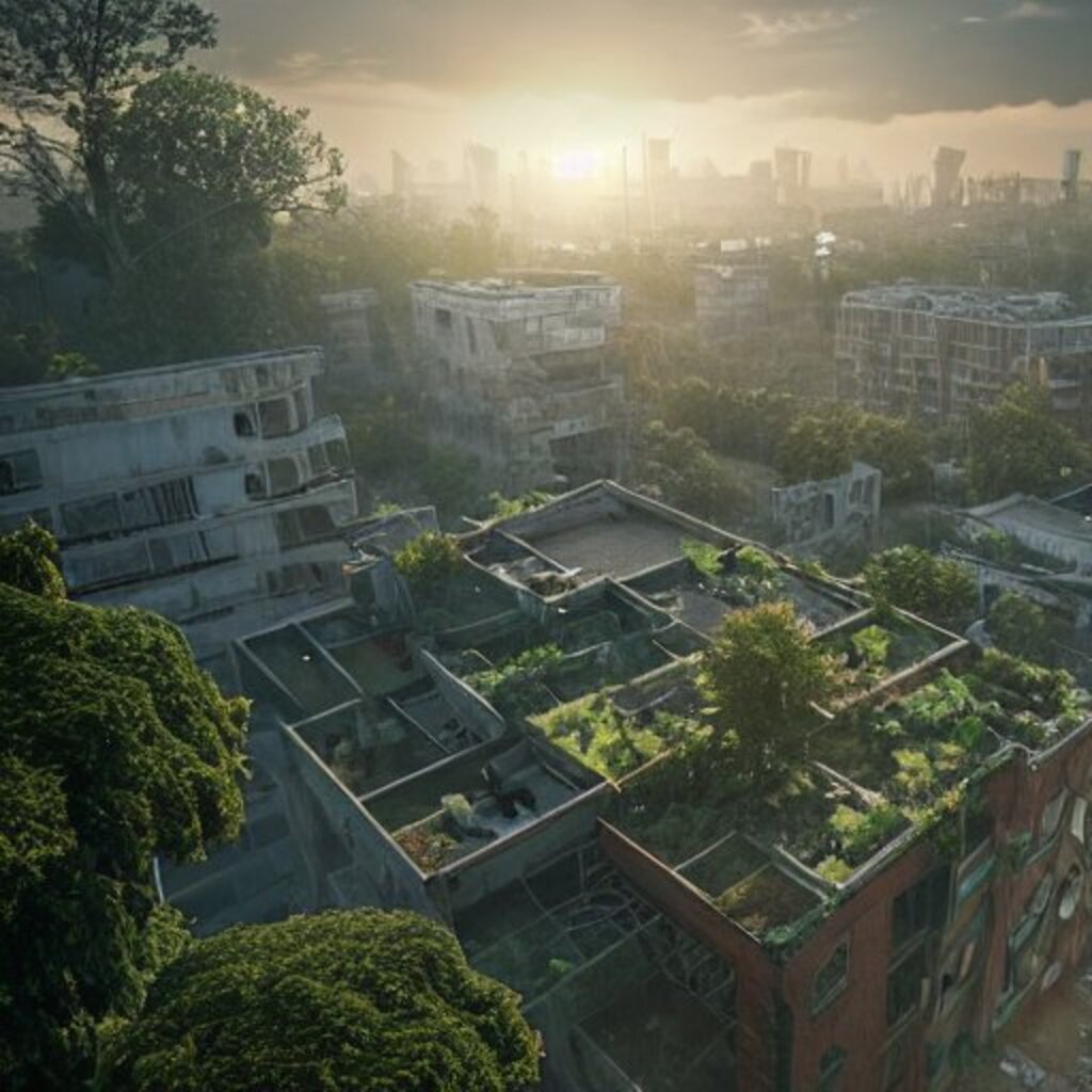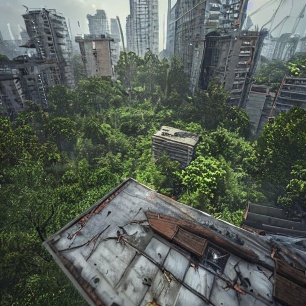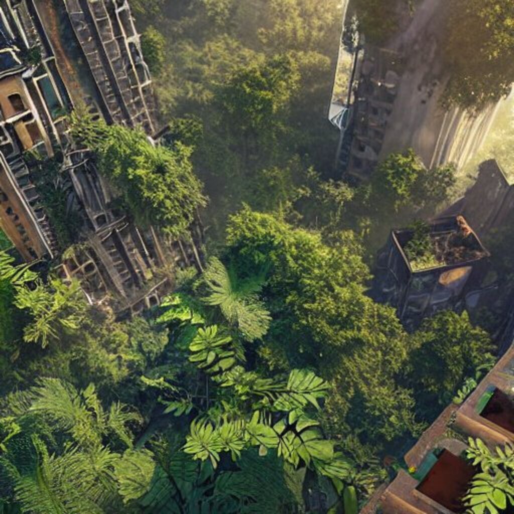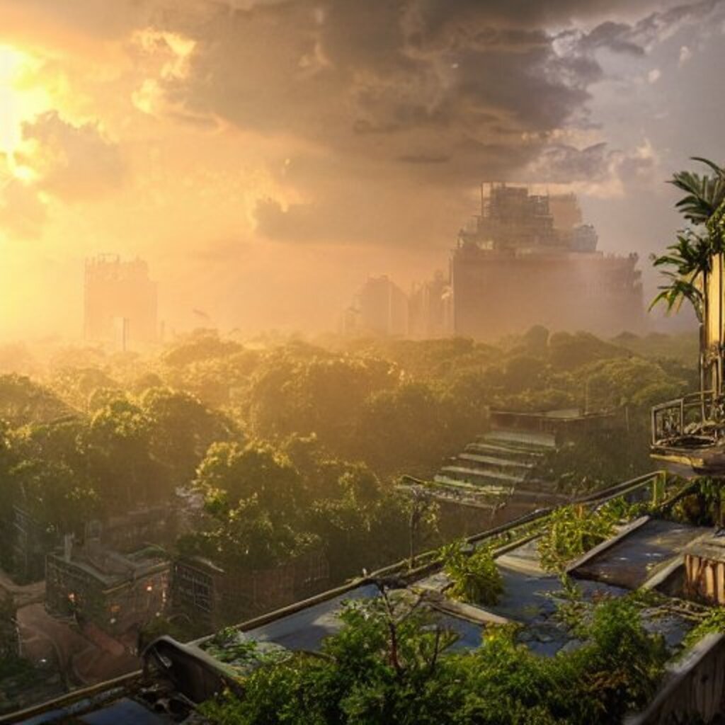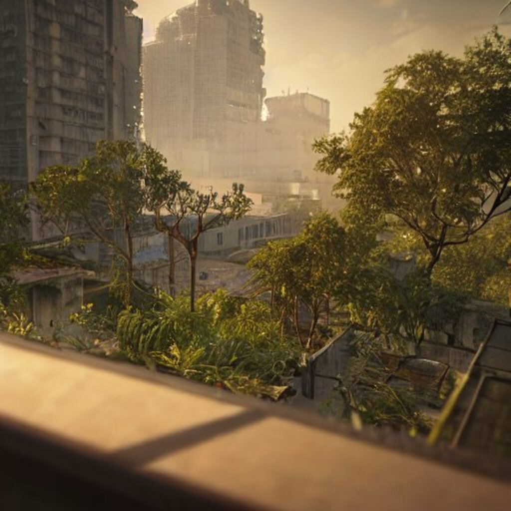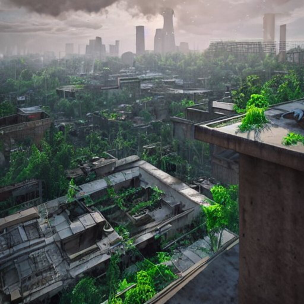 watching down from a rooftop to the overgrown abandoned ruins of mega city, toxic air, green sunset, green plant and trees, corona render, matte painting, god rays volume light, 4k, hyperrealistic, focused, 8 k, high details, unreal engine 5, cinematic, masterpiece