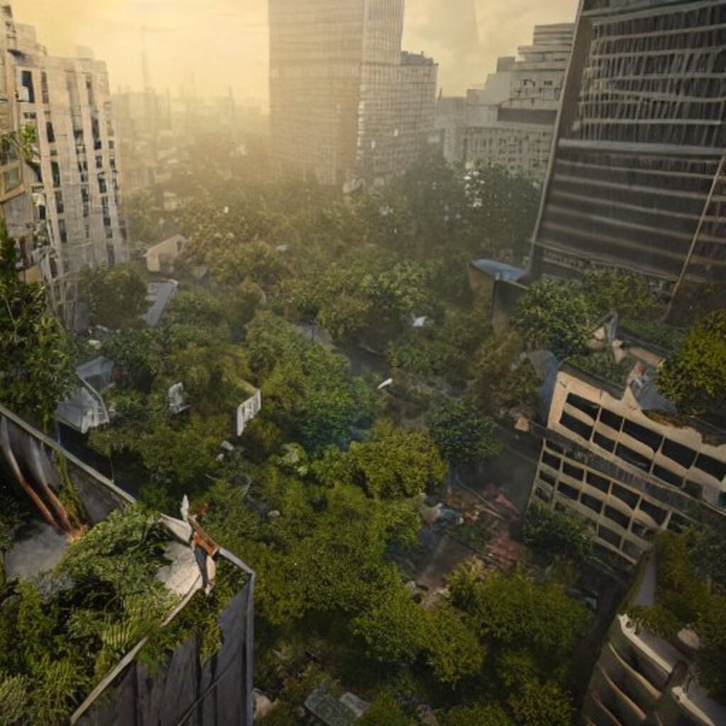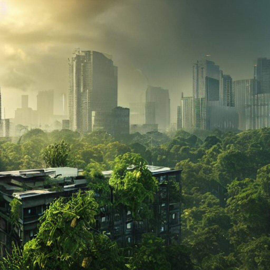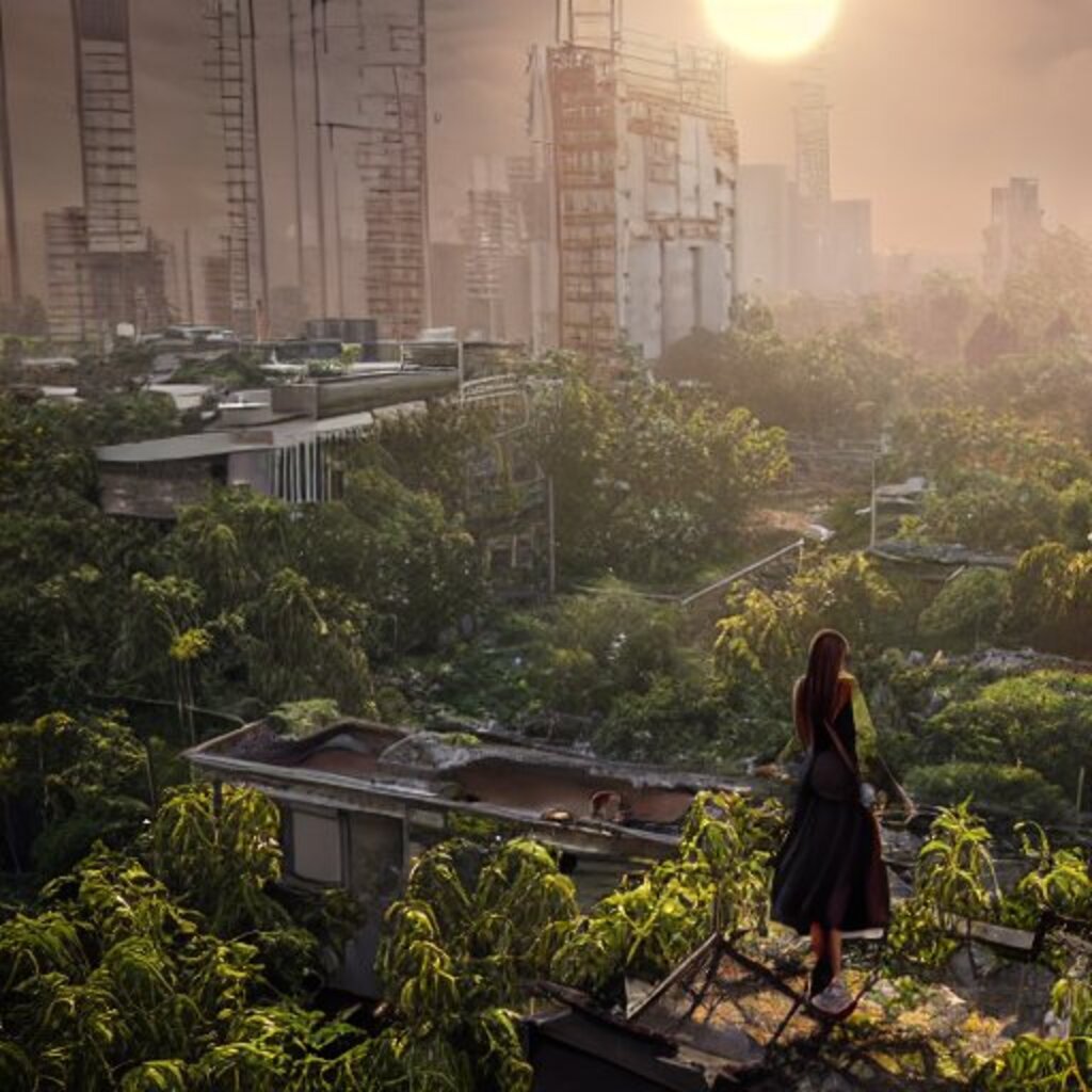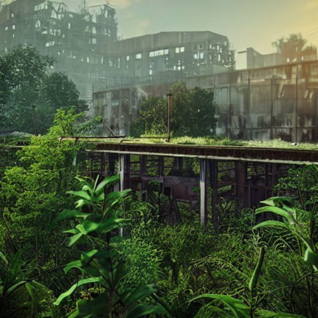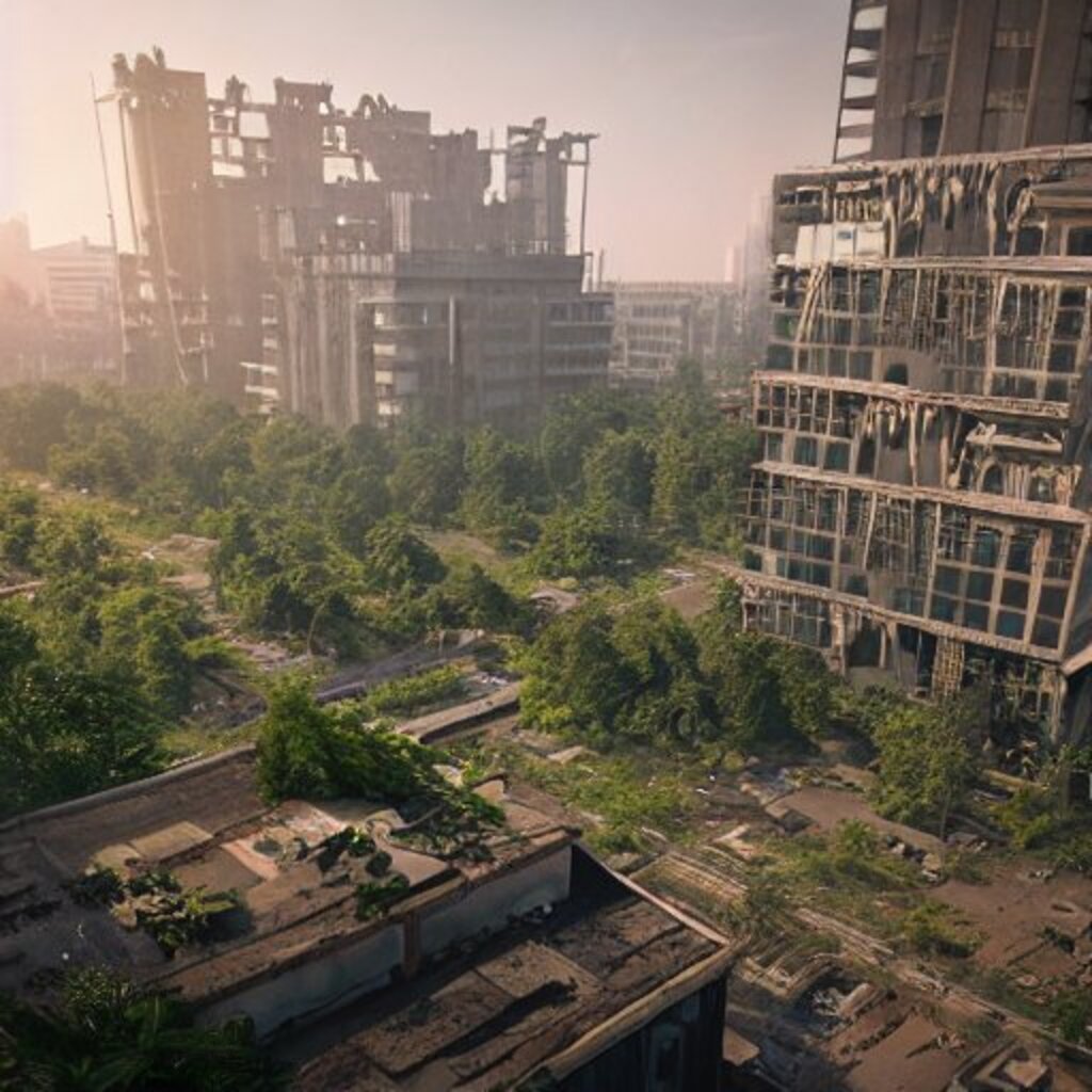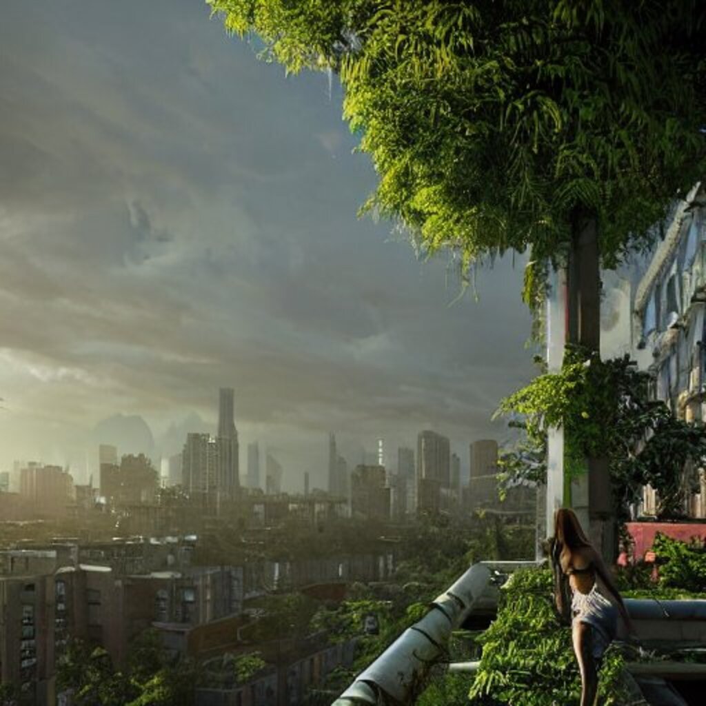 watching down from a rooftop to the overgrown abandoned ruins of mega city, toxic air, green sunset, green plant and trees, corona render, matte painting, god rays volume light, 4k, hyperrealistic, focused, 8 k, high details, unreal engine 5, cinematic, masterpiece