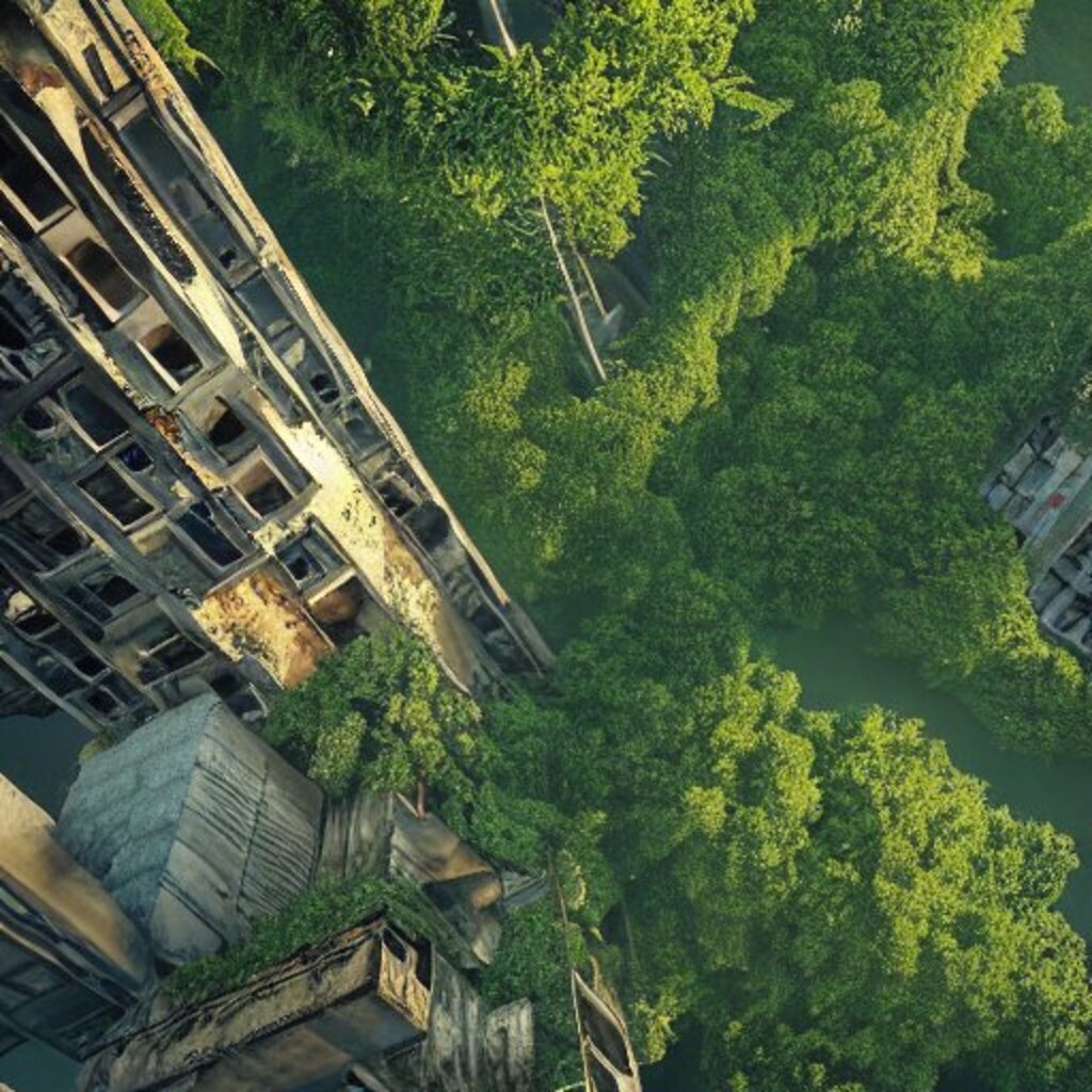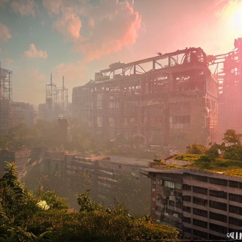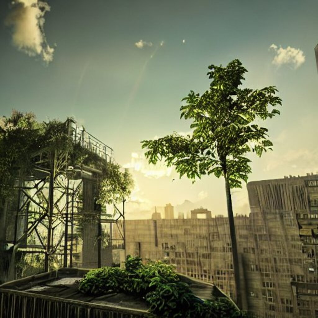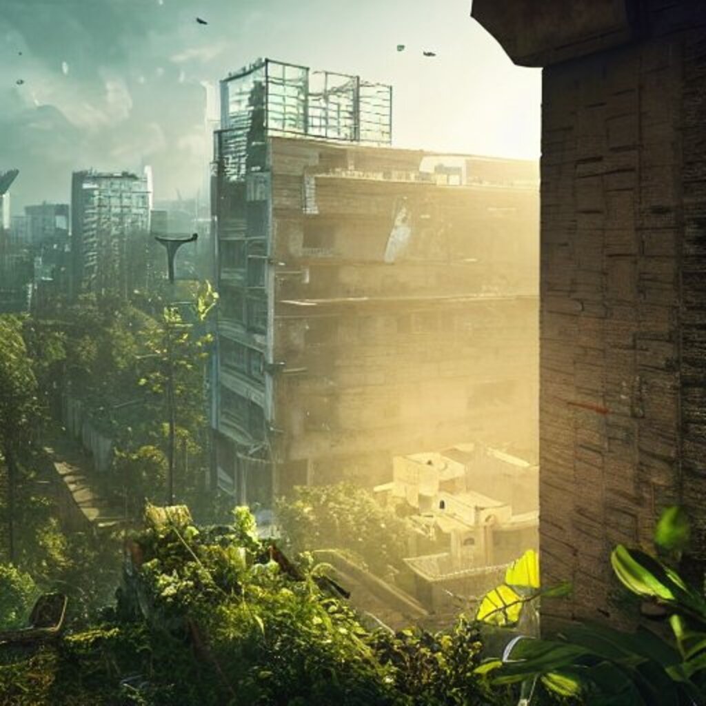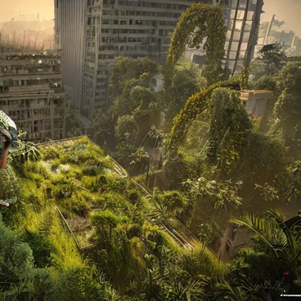 watching down from a rooftop to the overgrown abandoned ruins of mega city, toxic air, green sunset, green plant and trees, corona render, matte painting, god rays volume light, 4k, hyperrealistic, focused, 8 k, high details, unreal engine 5, cinematic, masterpiece