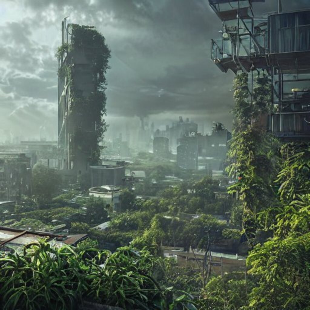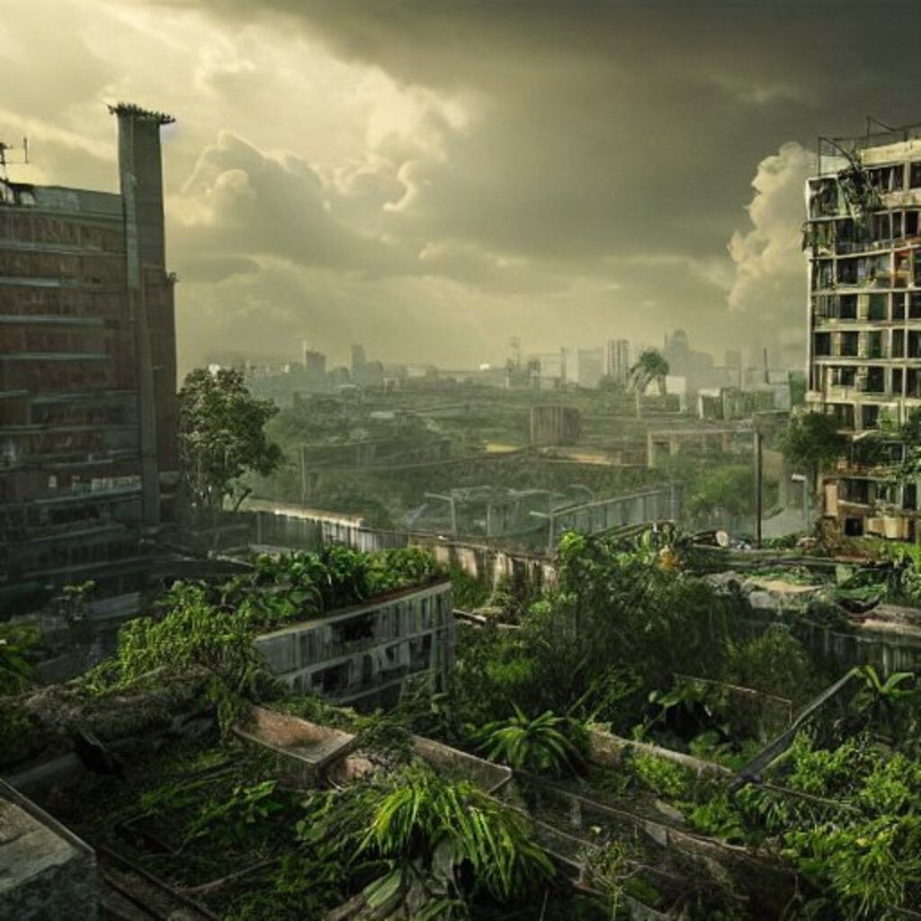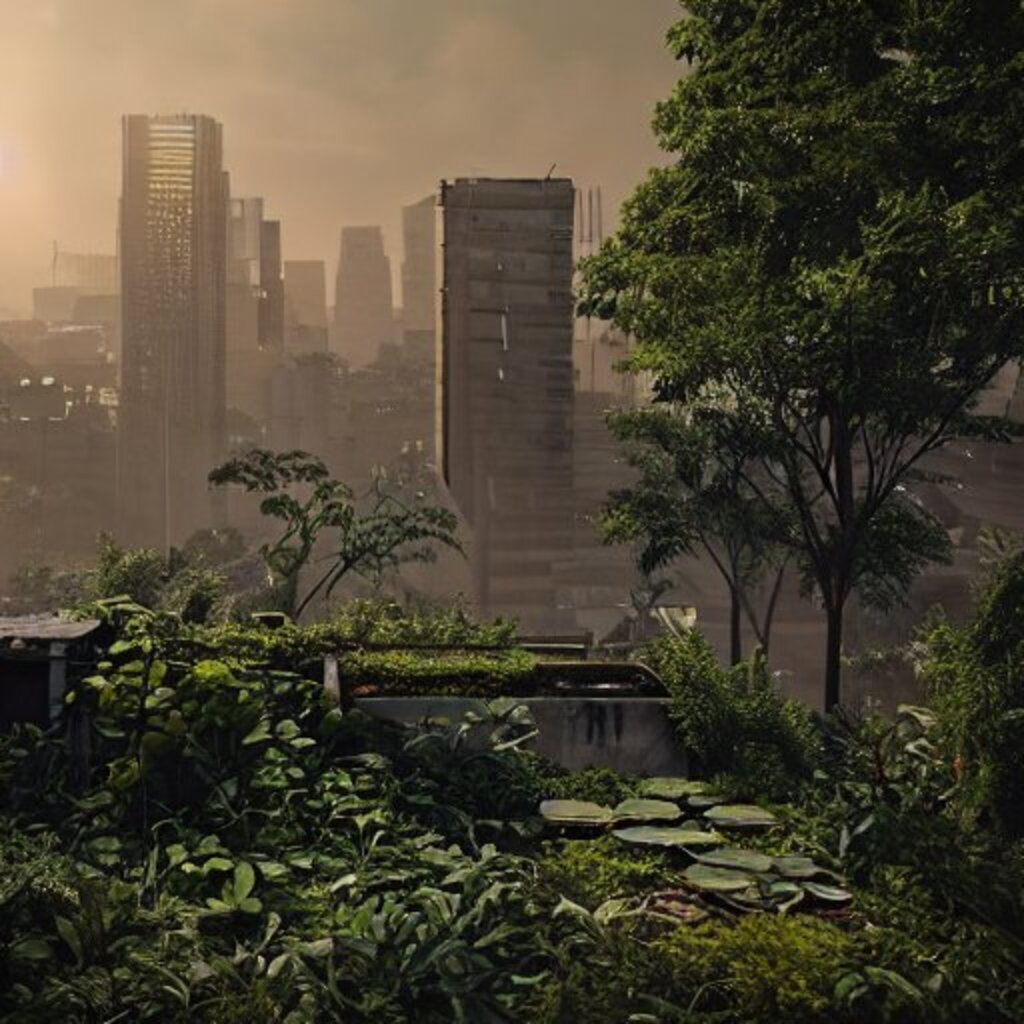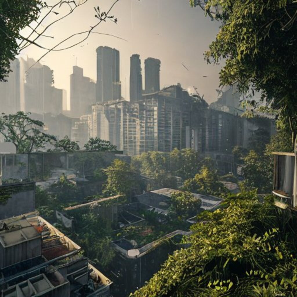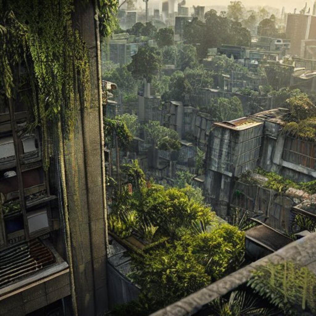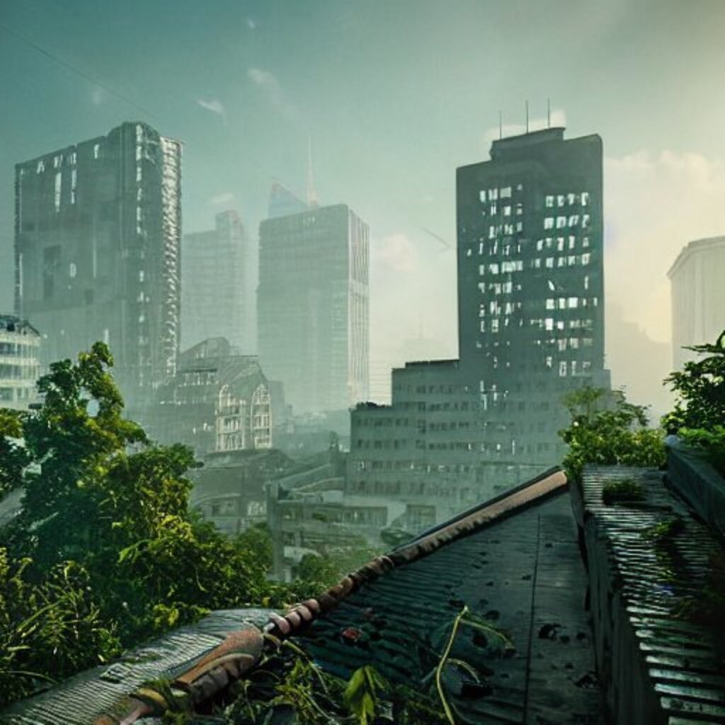 watching down from a rooftop to the overgrown abandoned ruins of mega city, toxic air, green sunset, green plant and trees, corona render, matte painting, god rays volume light, 4k, hyperrealistic, focused, 8 k, high details, unreal engine 5, cinematic, masterpiece