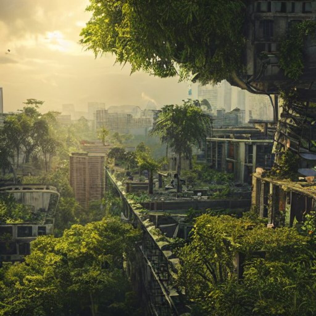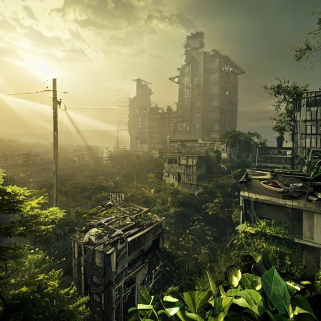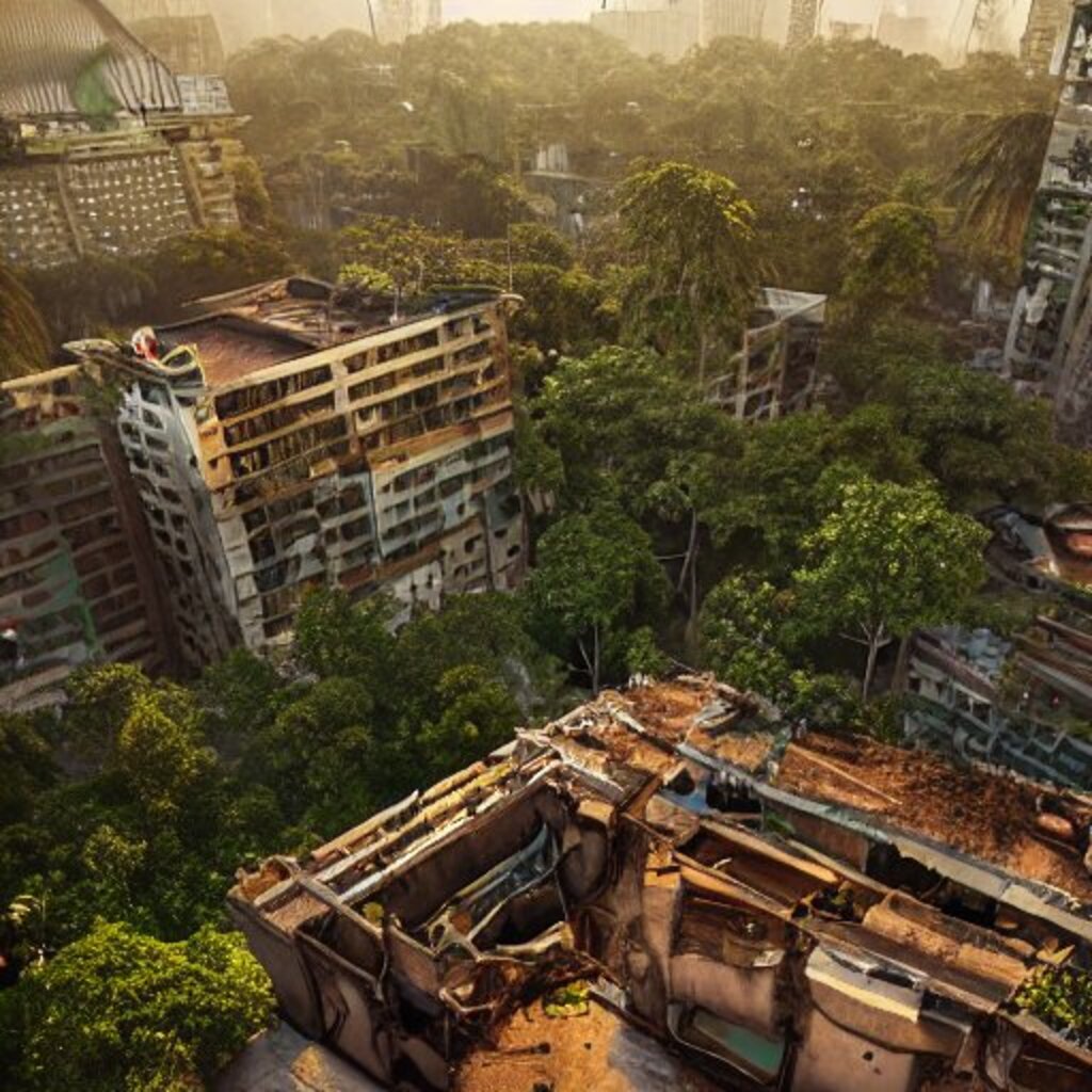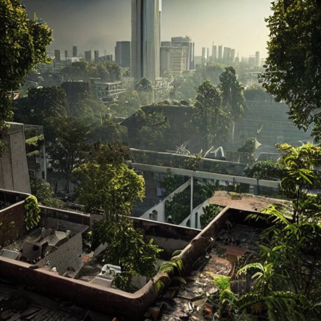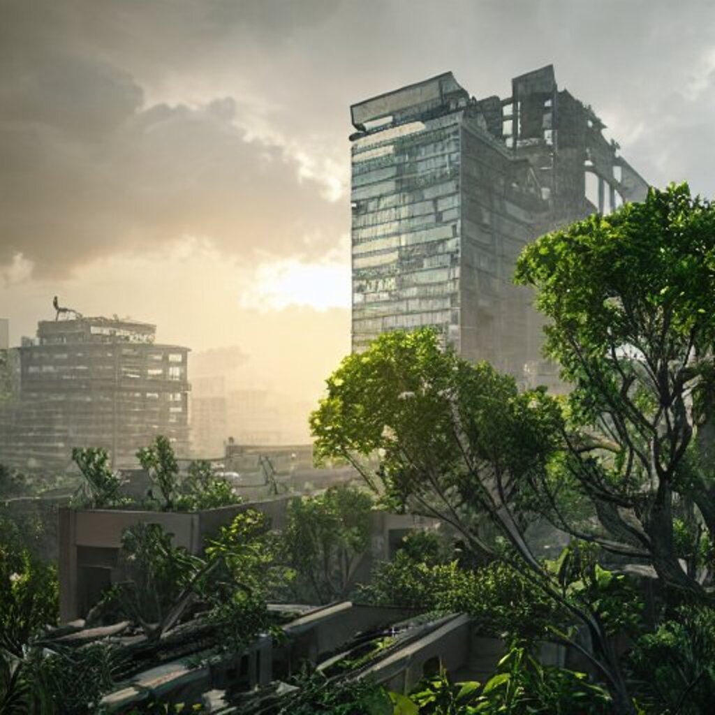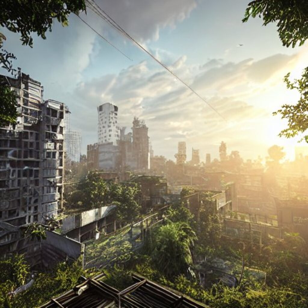 watching down from a rooftop to the overgrown abandoned ruins of mega city, toxic air, green sunset, green plant and trees, corona render, matte painting, god rays volume light, 4k, hyperrealistic, focused, 8 k, high details, unreal engine 5, cinematic, masterpiece