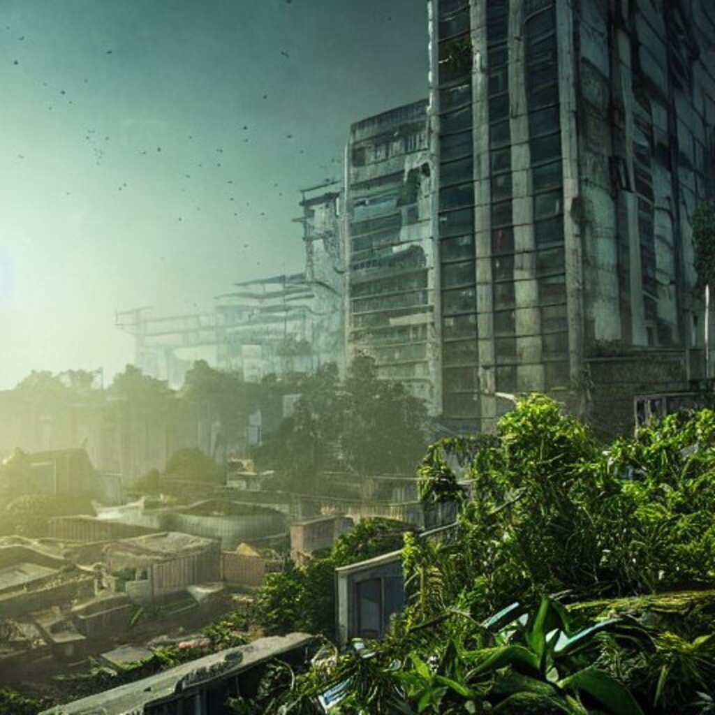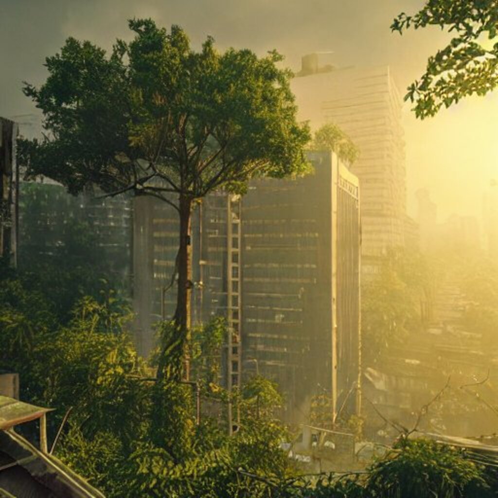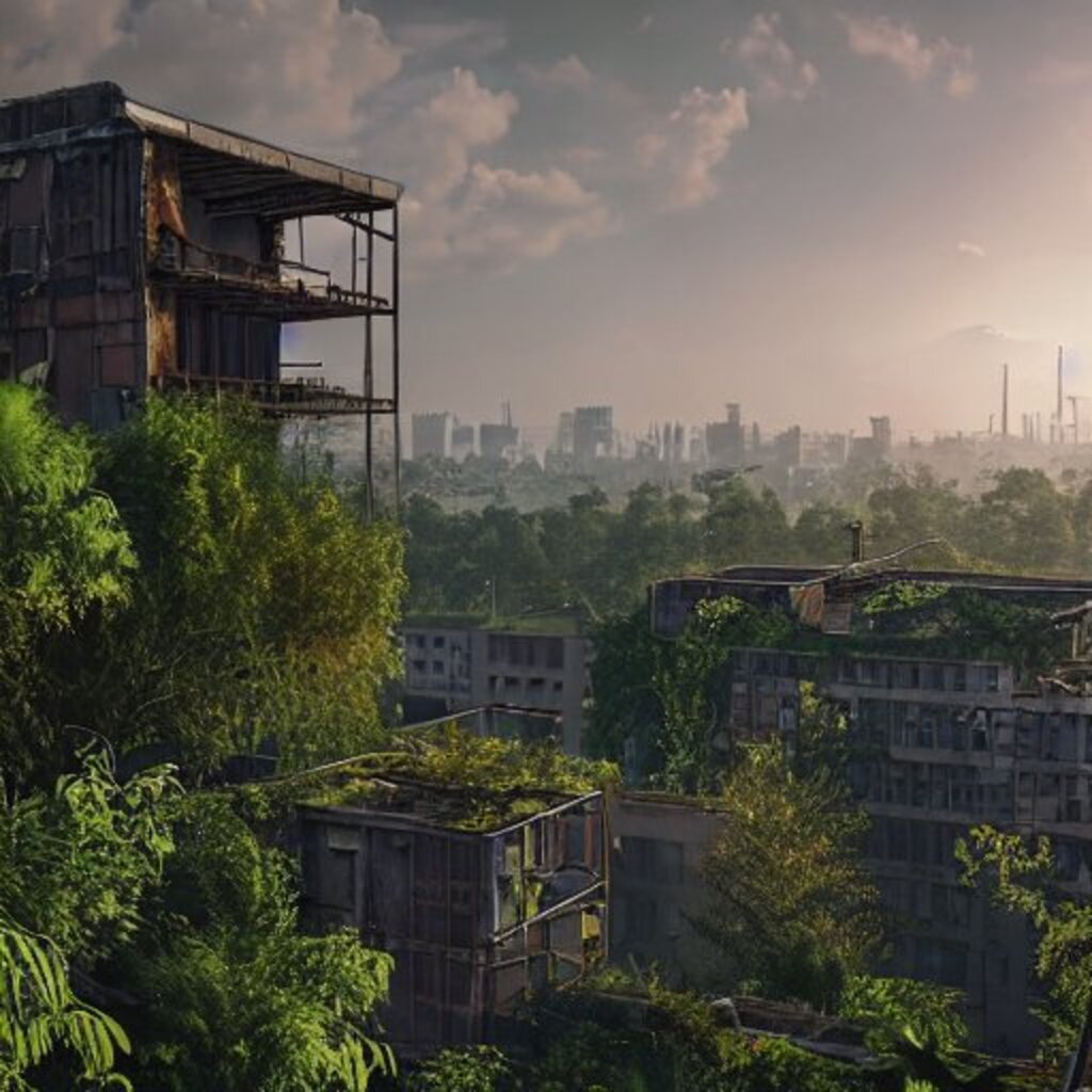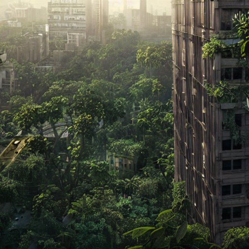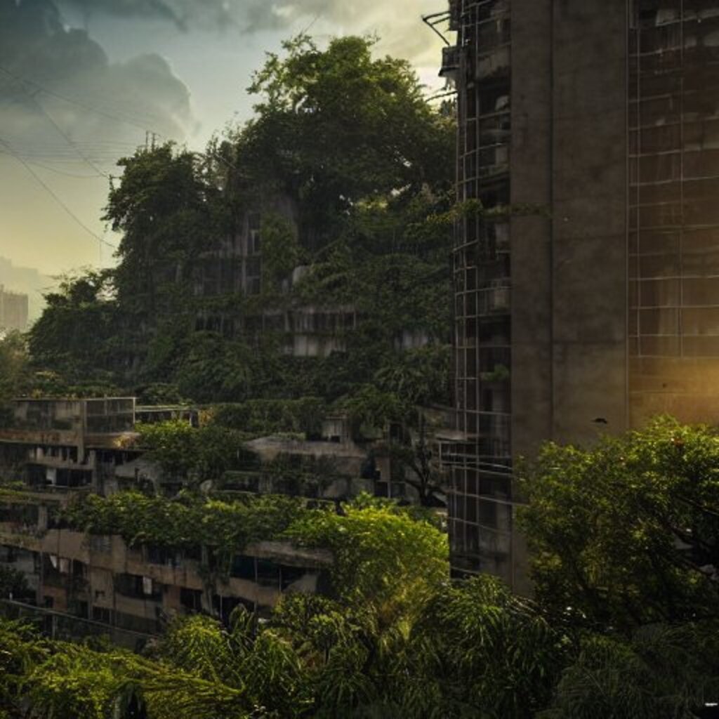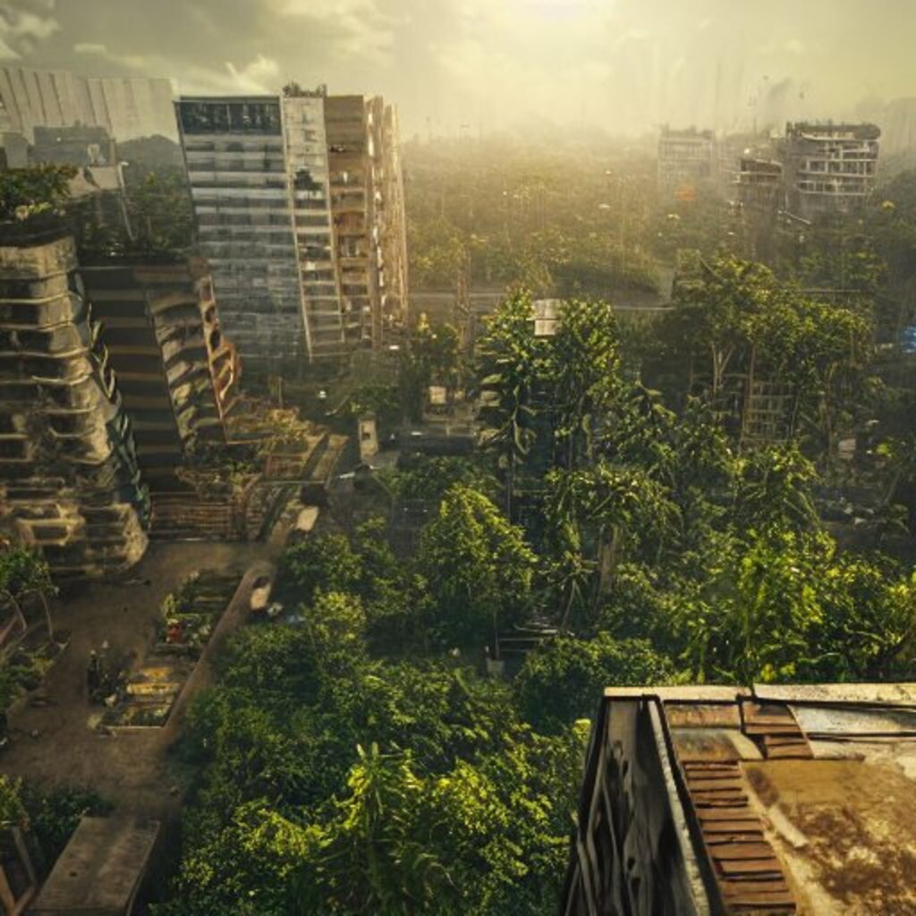 watching down from a rooftop to the overgrown abandoned ruins of mega city, toxic air, green sunset, green plant and trees, corona render, matte painting, god rays volume light, 4k, hyperrealistic, focused, 8 k, high details, unreal engine 5, cinematic, masterpiece