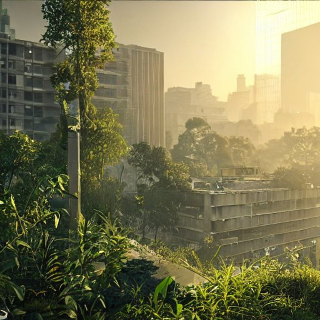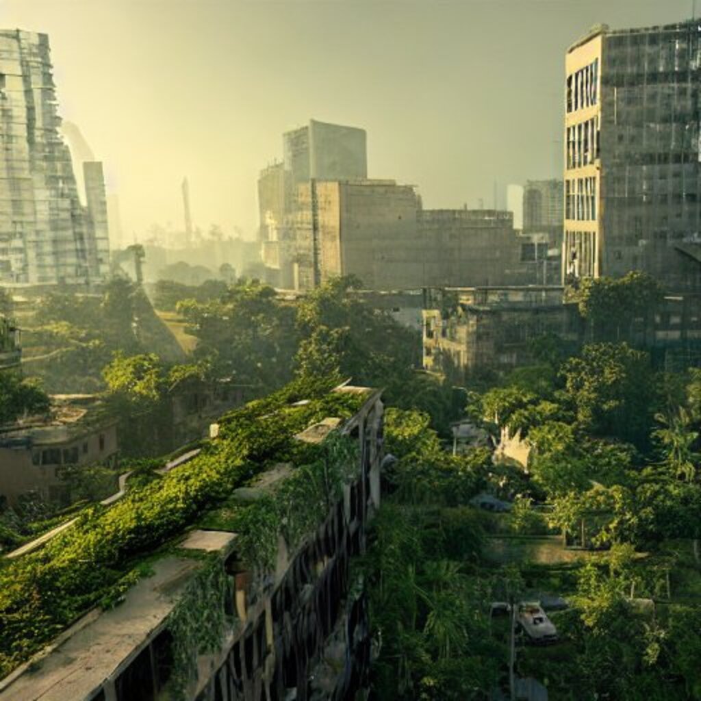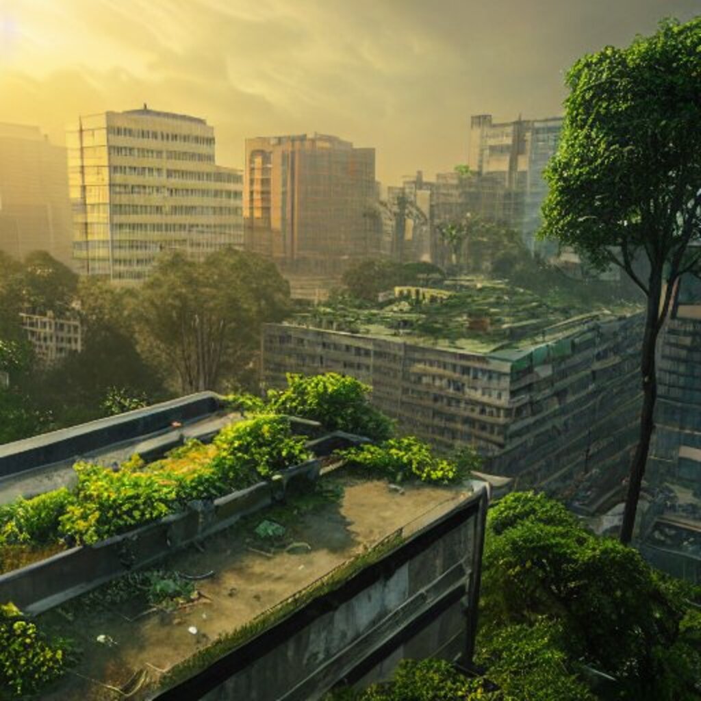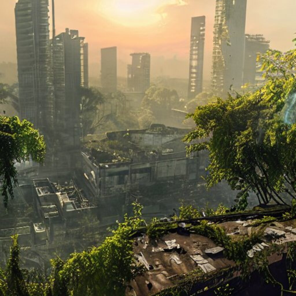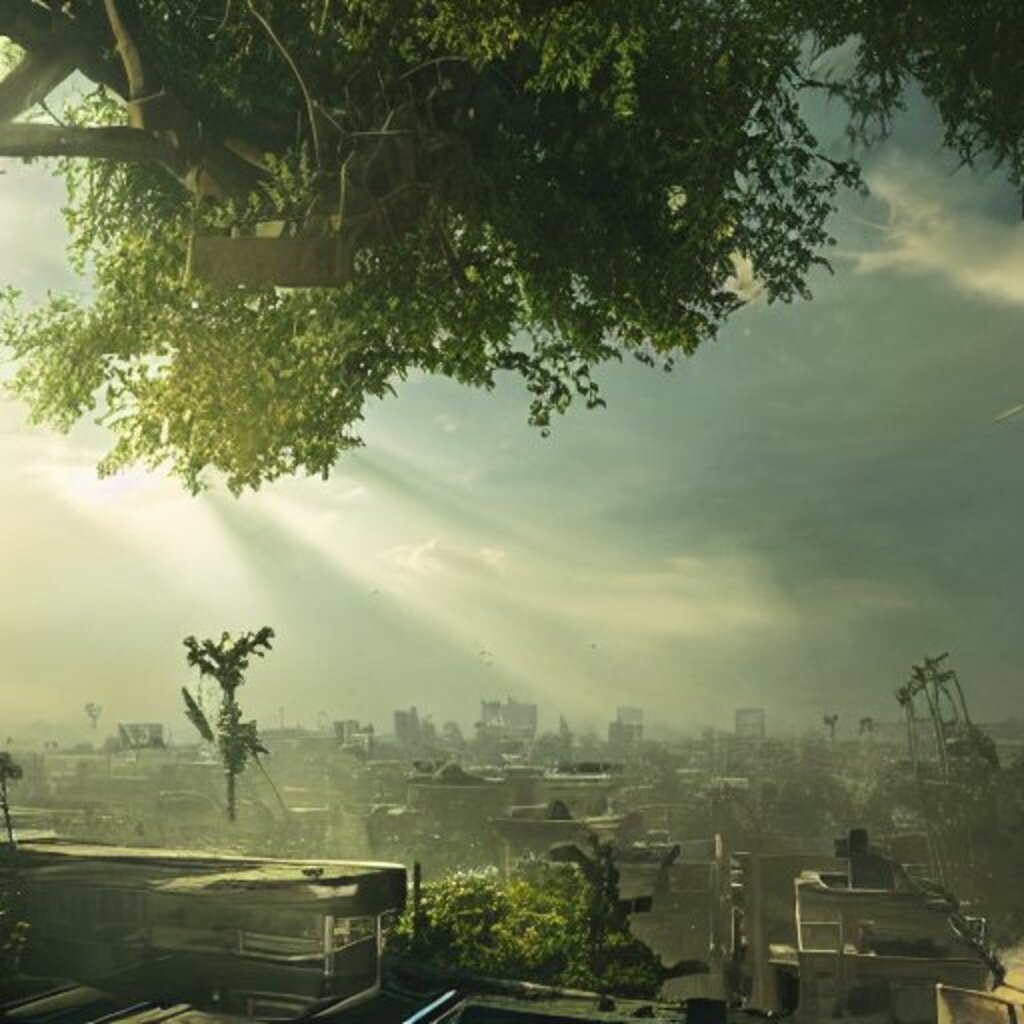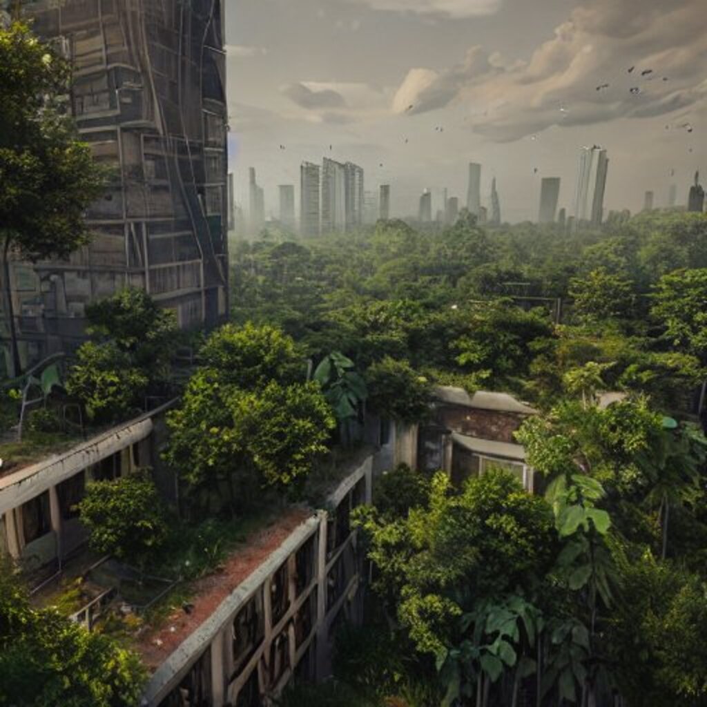 watching down from a rooftop to the overgrown abandoned ruins of mega city, toxic air, green sunset, green plant and trees, corona render, matte painting, god rays volume light, 4k, hyperrealistic, focused, 8 k, high details, unreal engine 5, cinematic, masterpiece