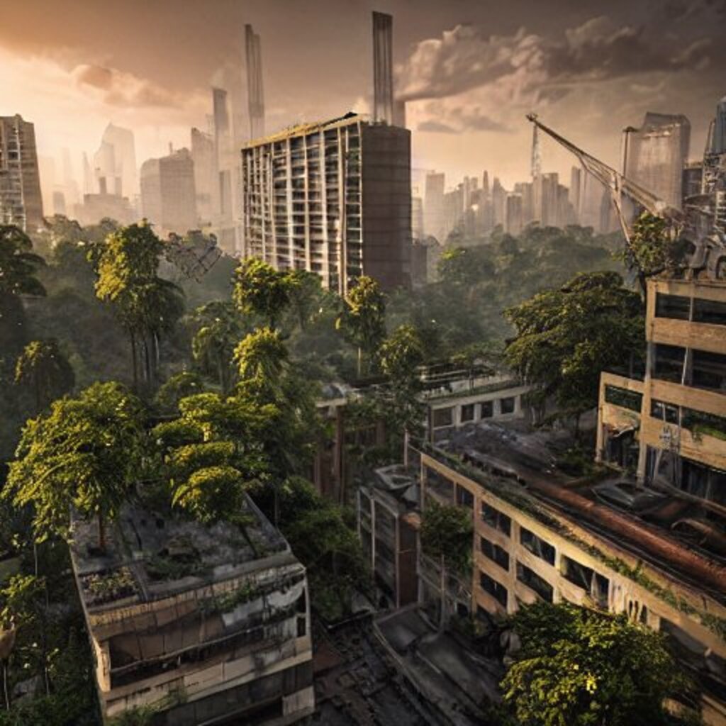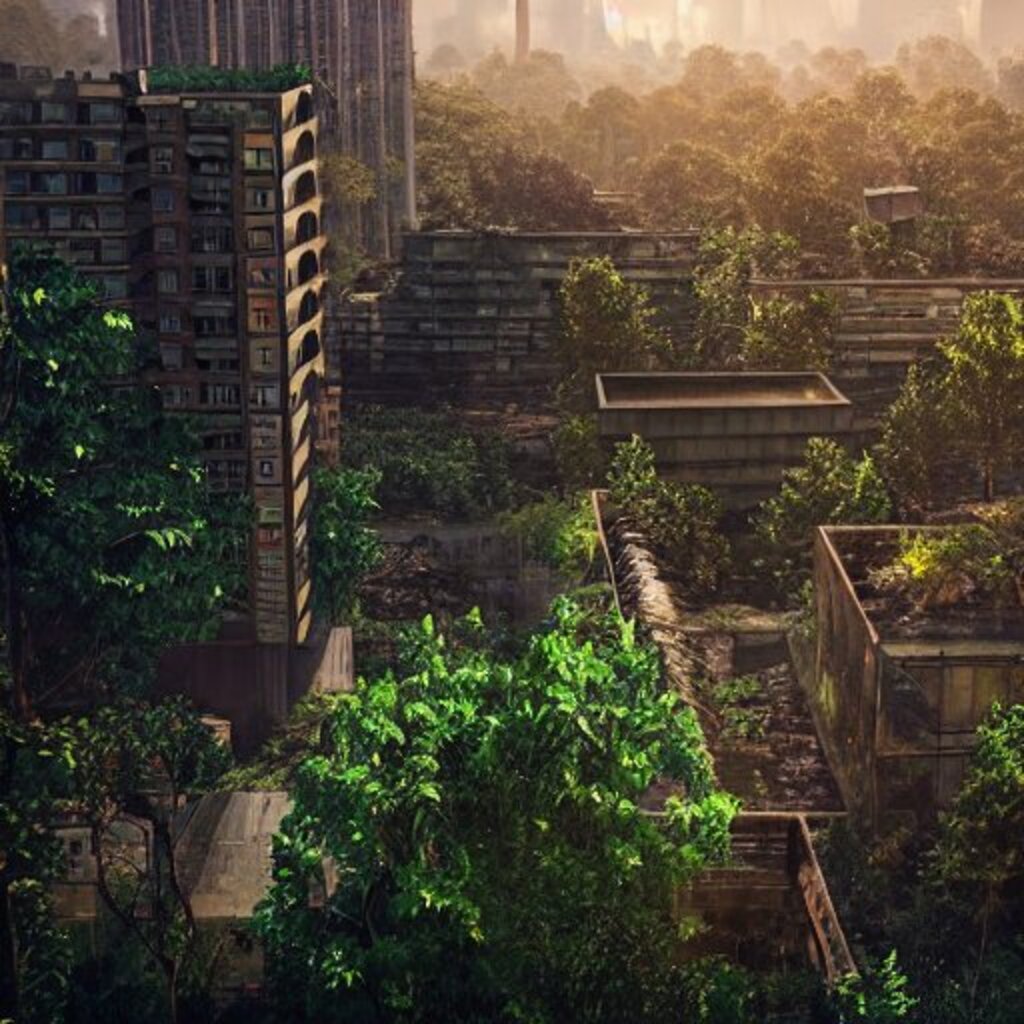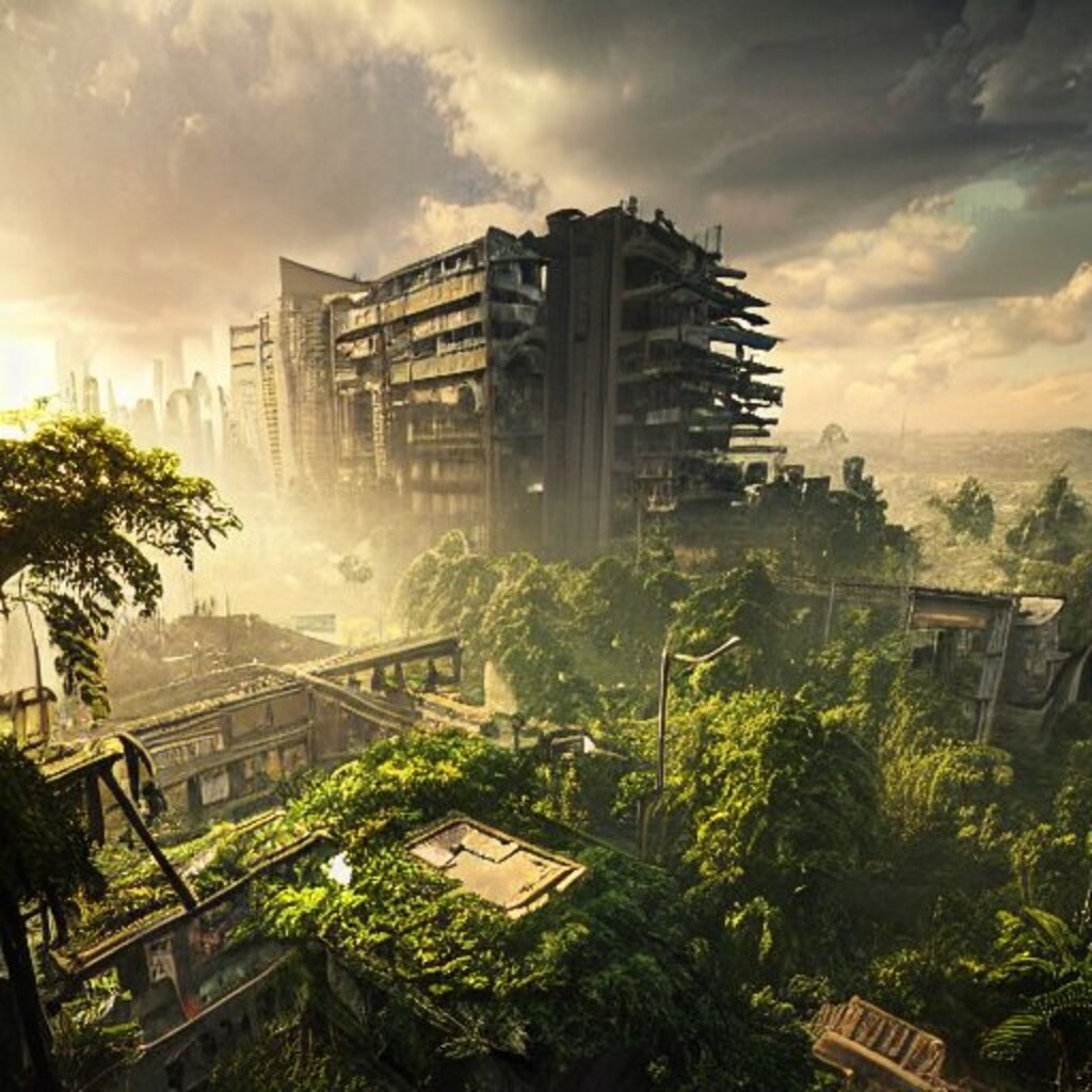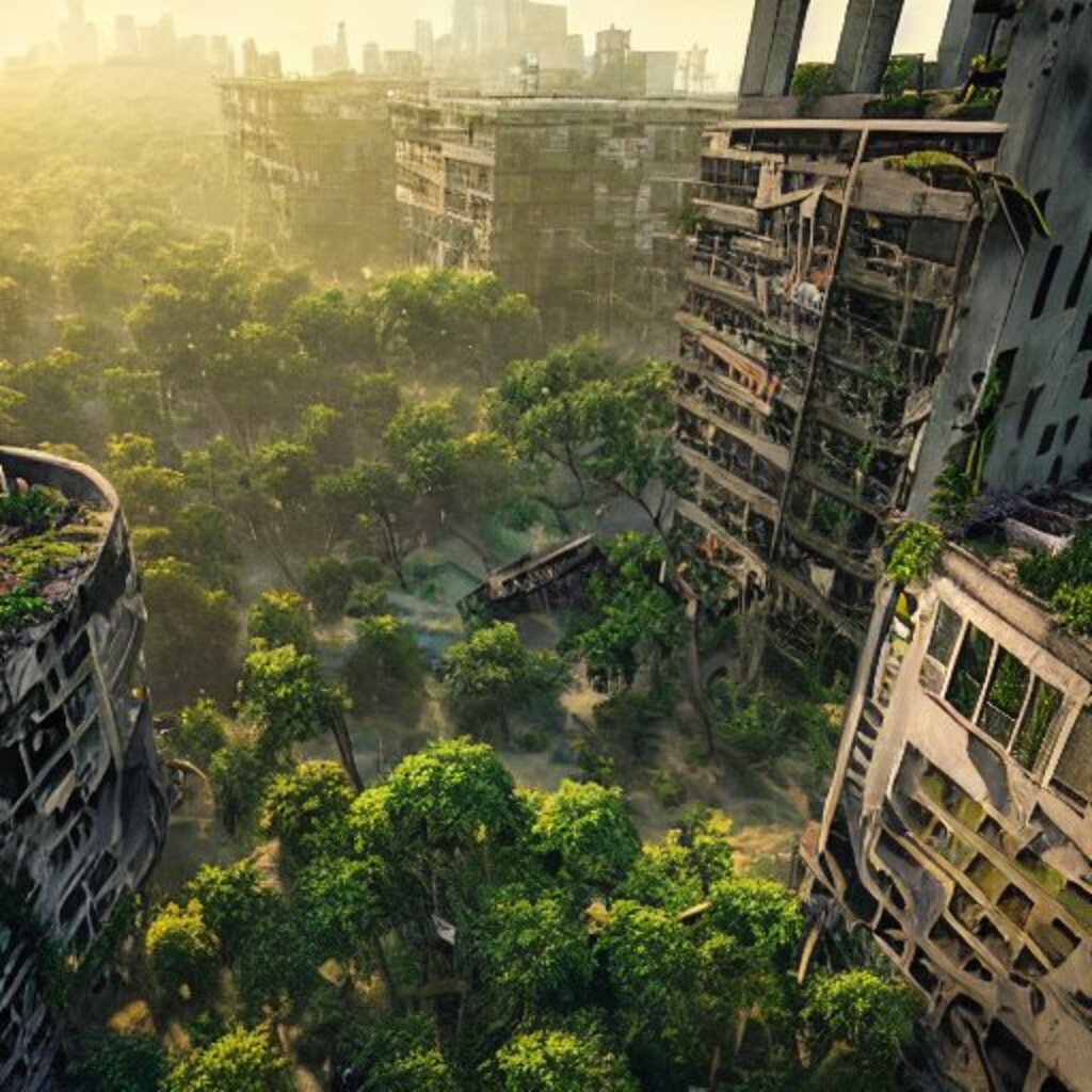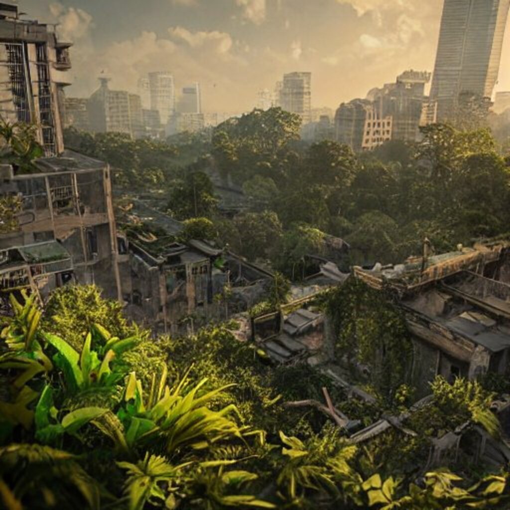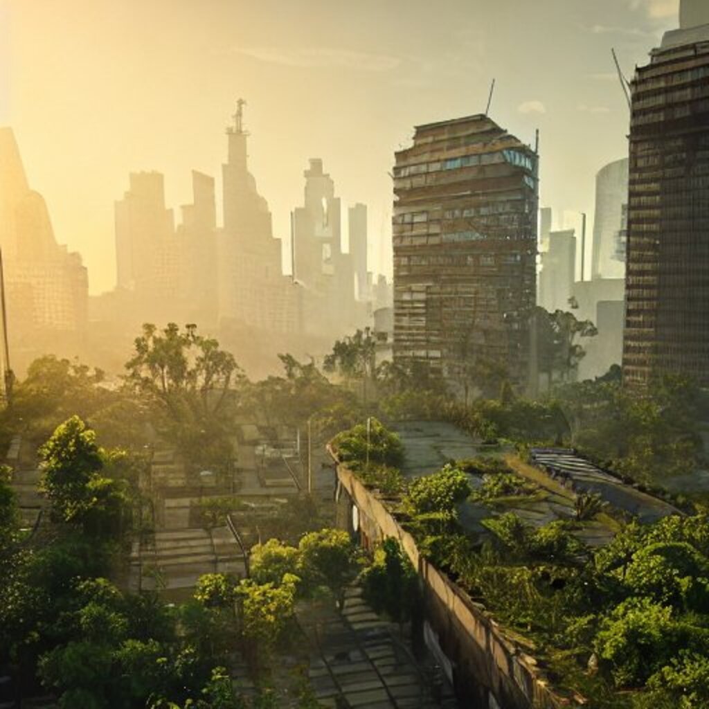 watching down from a rooftop to the overgrown abandoned ruins of mega city, toxic air, green sunset, green plant and trees, corona render, matte painting, god rays volume light, 4k, hyperrealistic, focused, 8 k, high details, unreal engine 5, cinematic, masterpiece