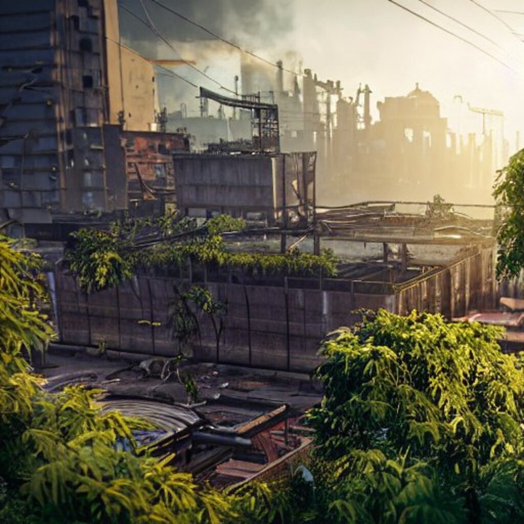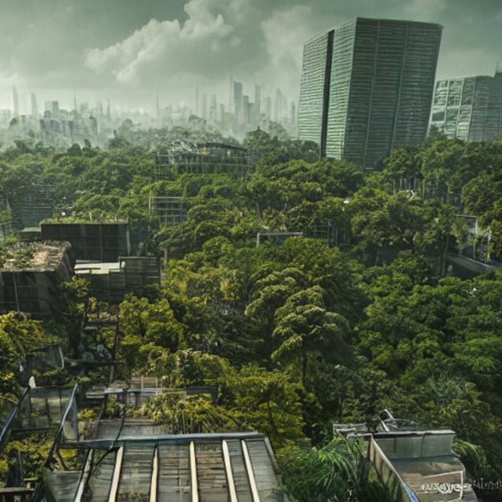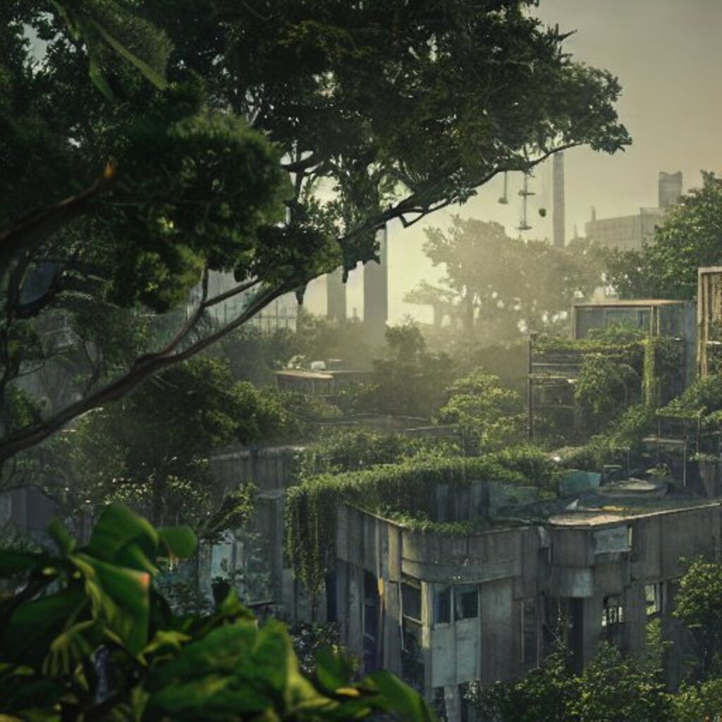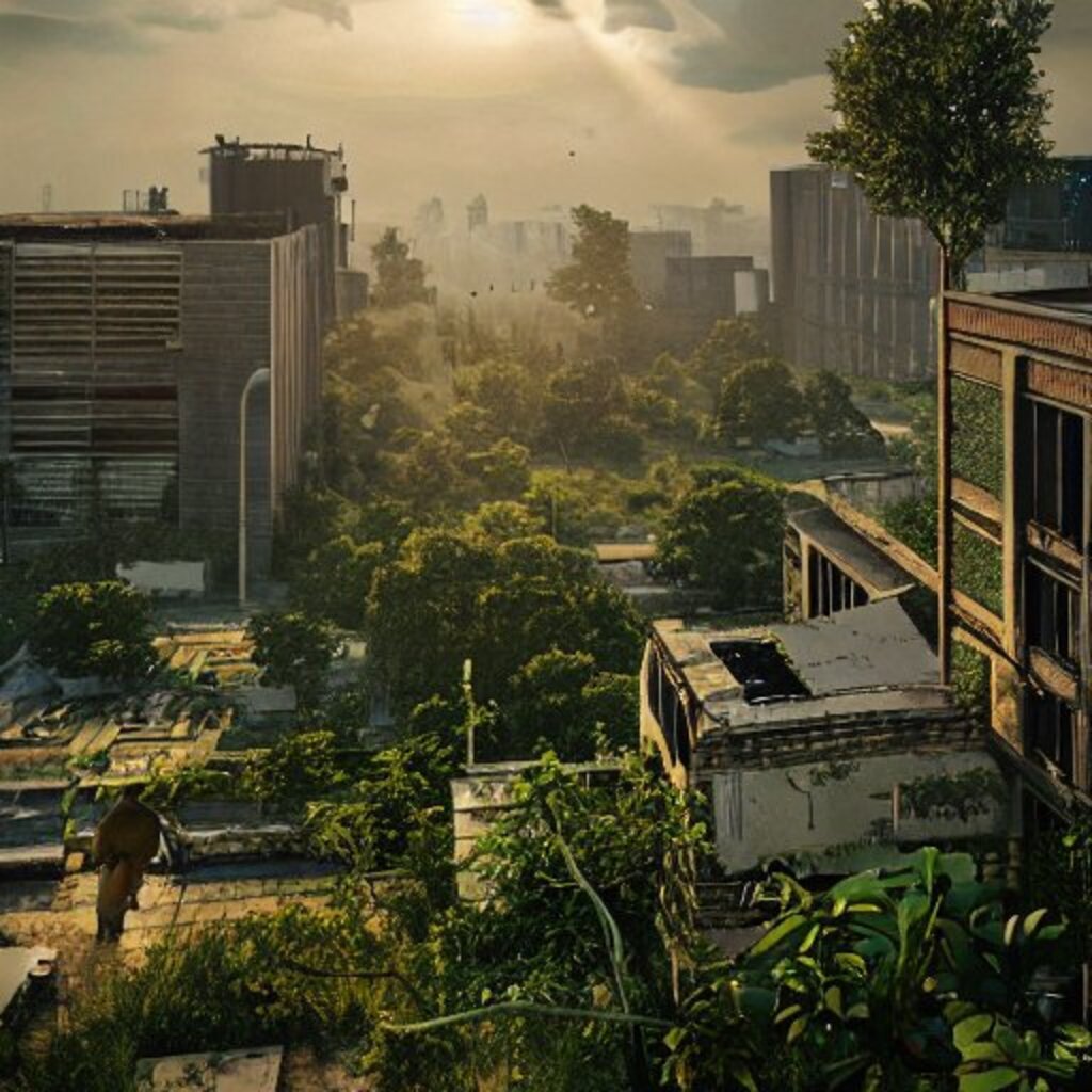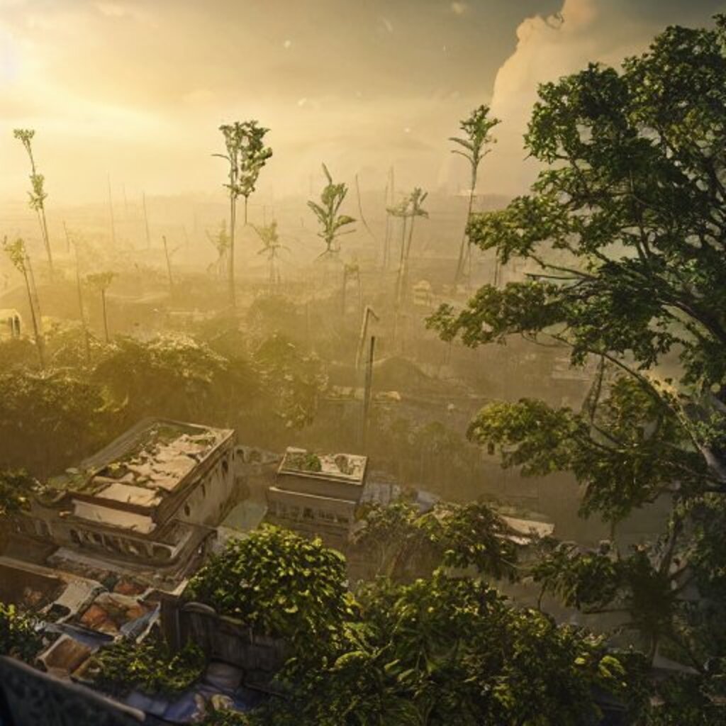 watching down from a rooftop to the overgrown abandoned ruins of mega city, toxic air, green sunset, green plant and trees, corona render, matte painting, god rays volume light, 4k, hyperrealistic, focused, 8 k, high details, unreal engine 5, cinematic, masterpiece