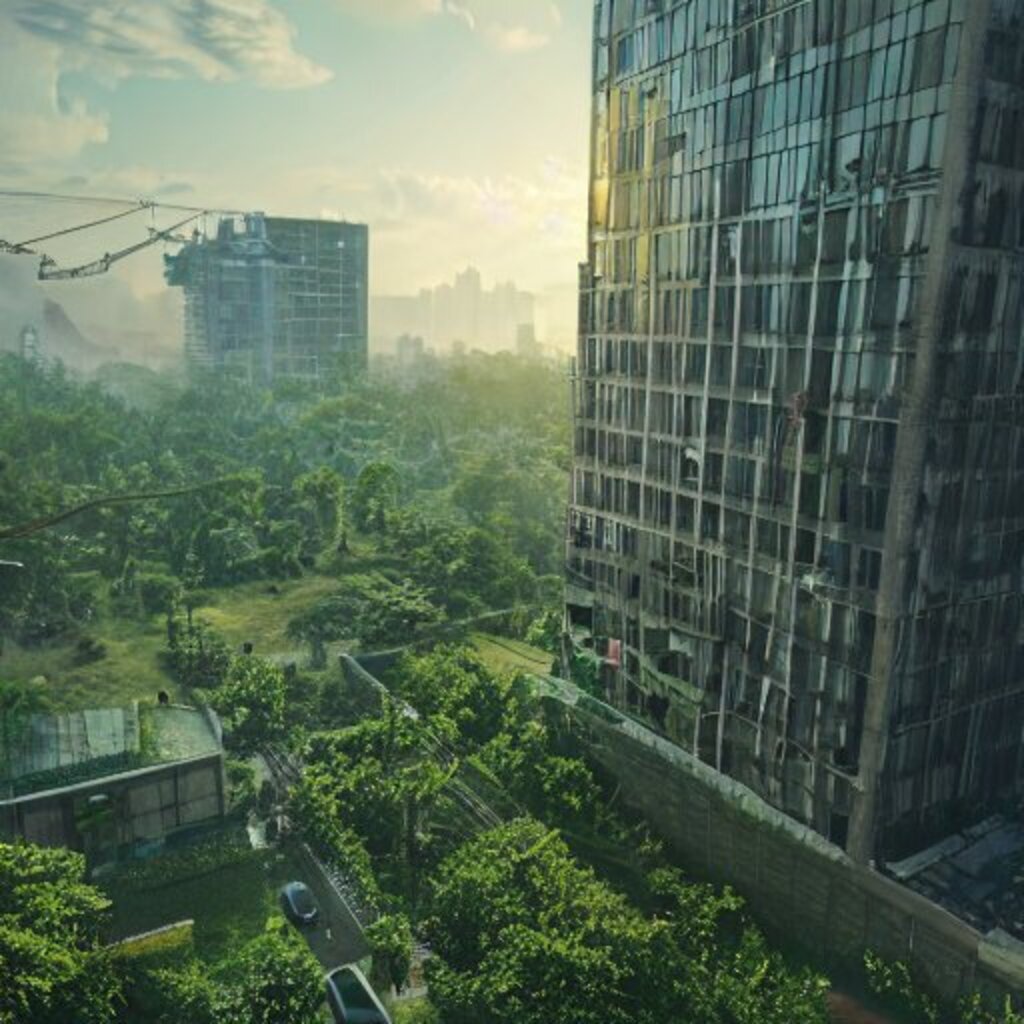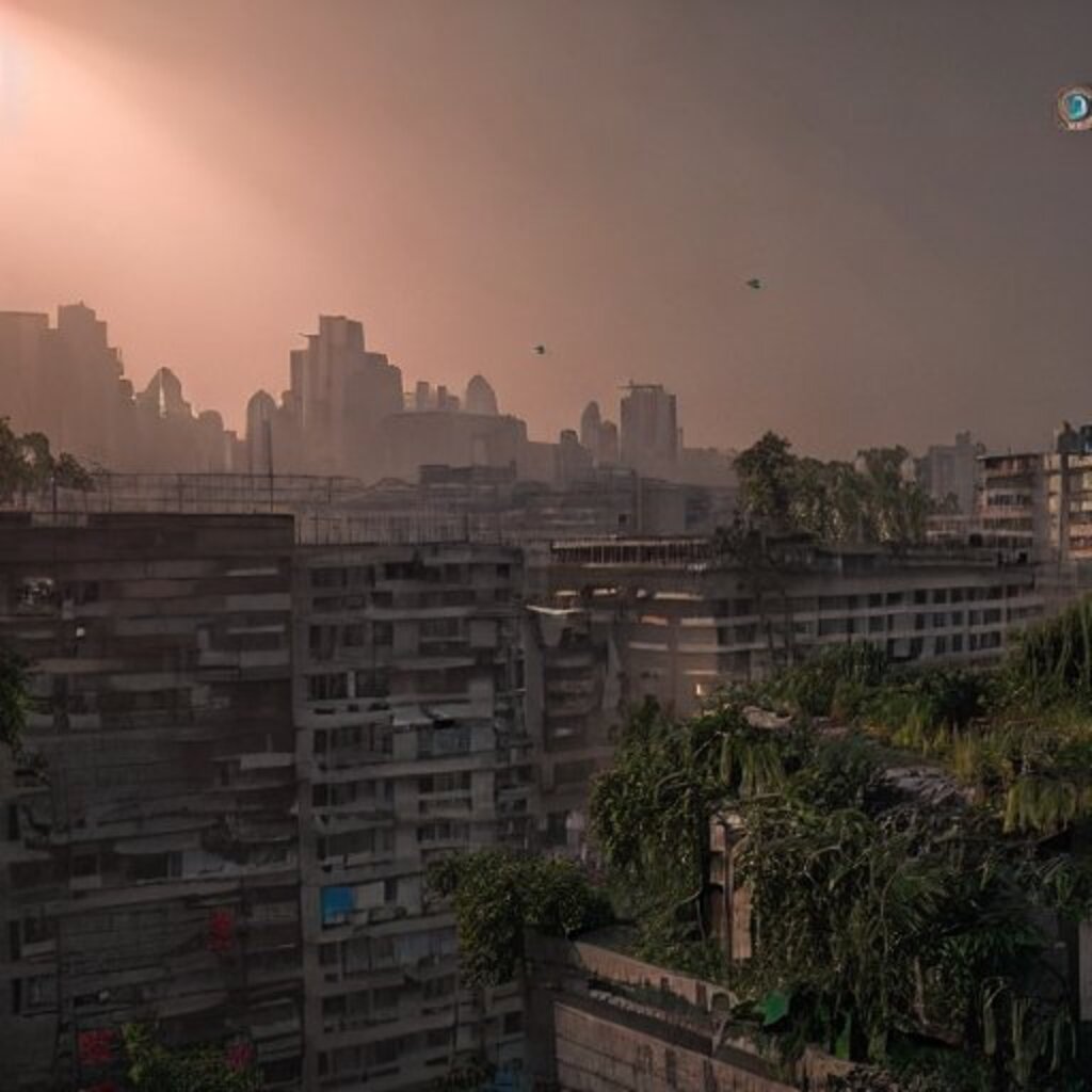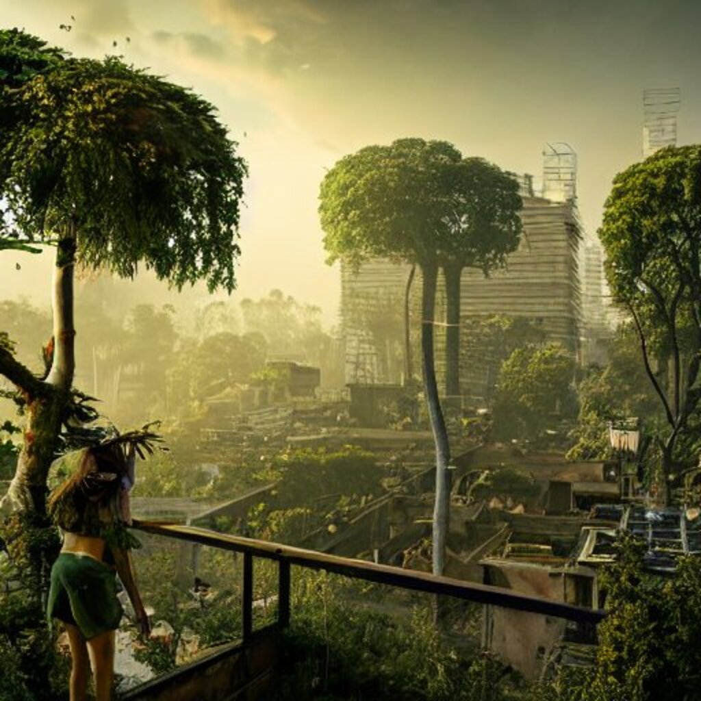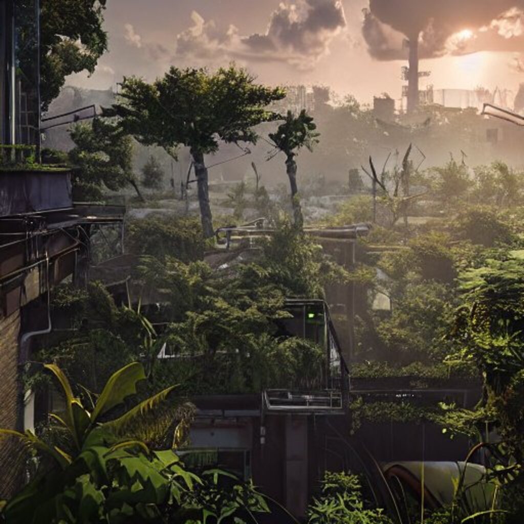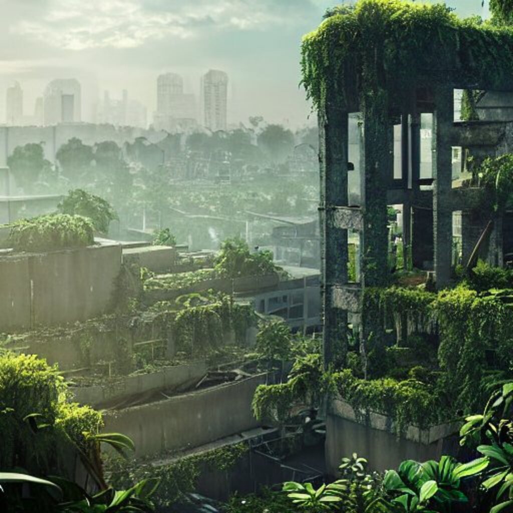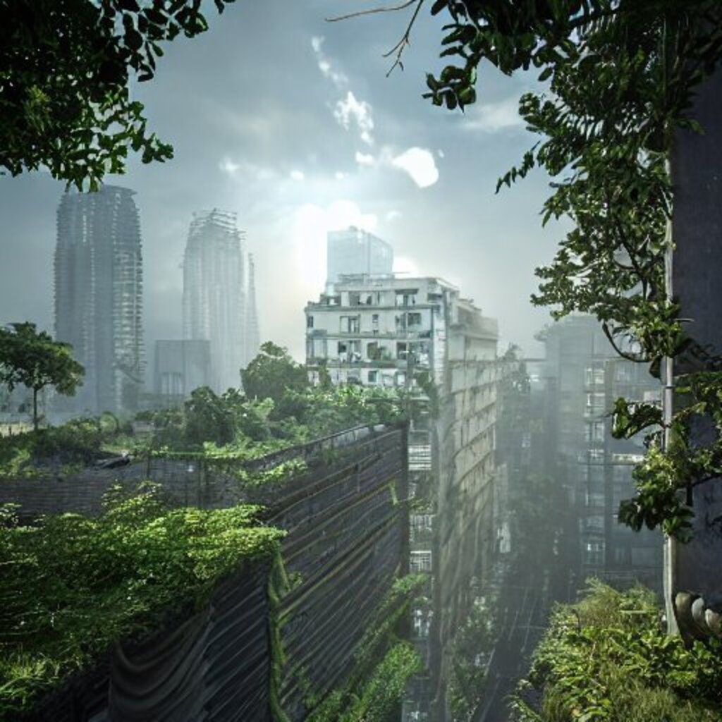 watching down from a rooftop to the overgrown abandoned ruins of mega city, toxic air, green sunset, green plant and trees, corona render, matte painting, god rays volume light, 4k, hyperrealistic, focused, 8 k, high details, unreal engine 5, cinematic, masterpiece