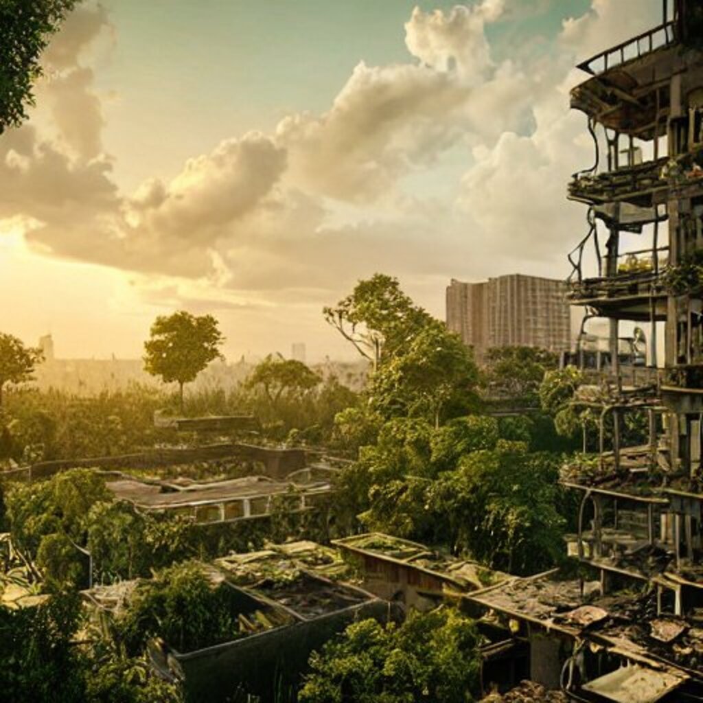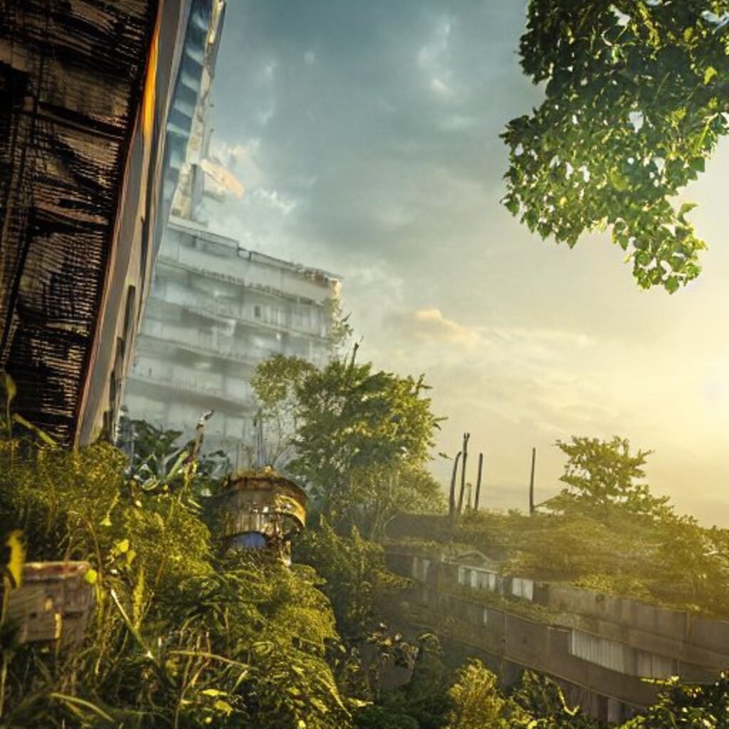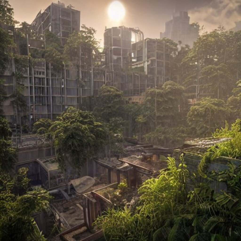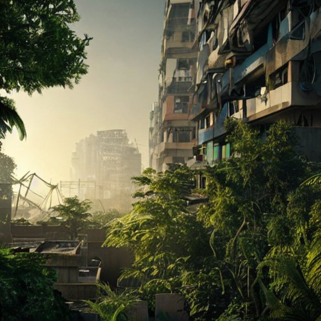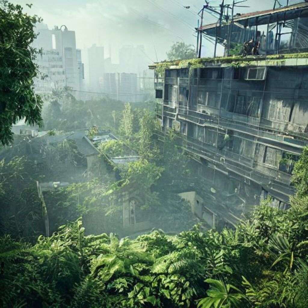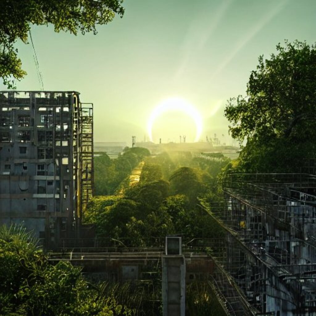 watching down from a rooftop to the overgrown abandoned ruins of mega city, toxic air, green sunset, green plant and trees, corona render, matte painting, god rays volume light, 4k, hyperrealistic, focused, 8 k, high details, unreal engine 5, cinematic, masterpiece