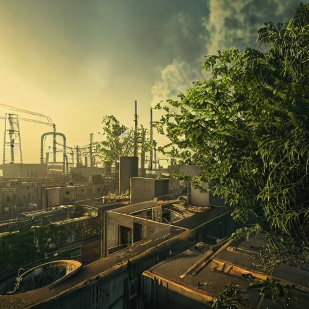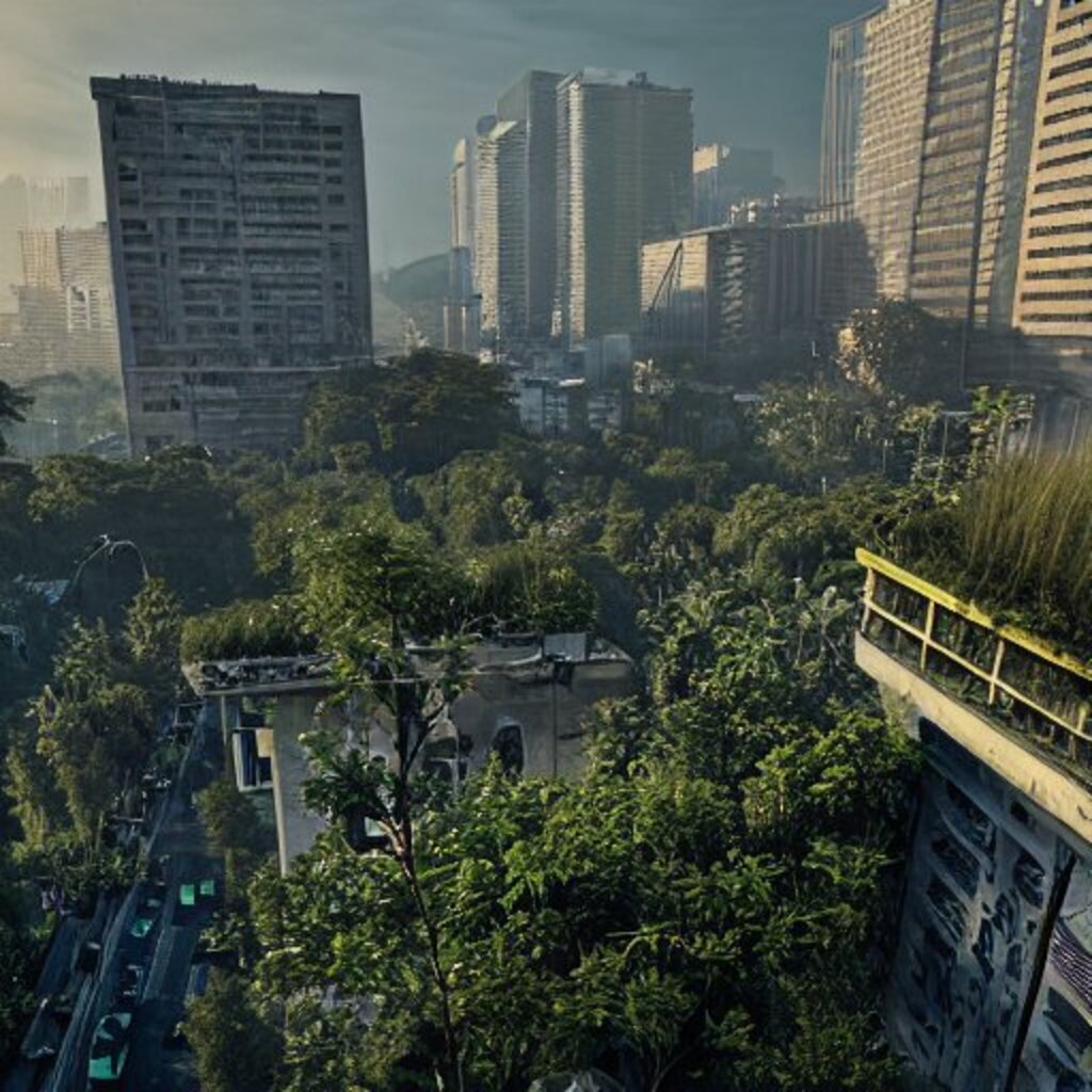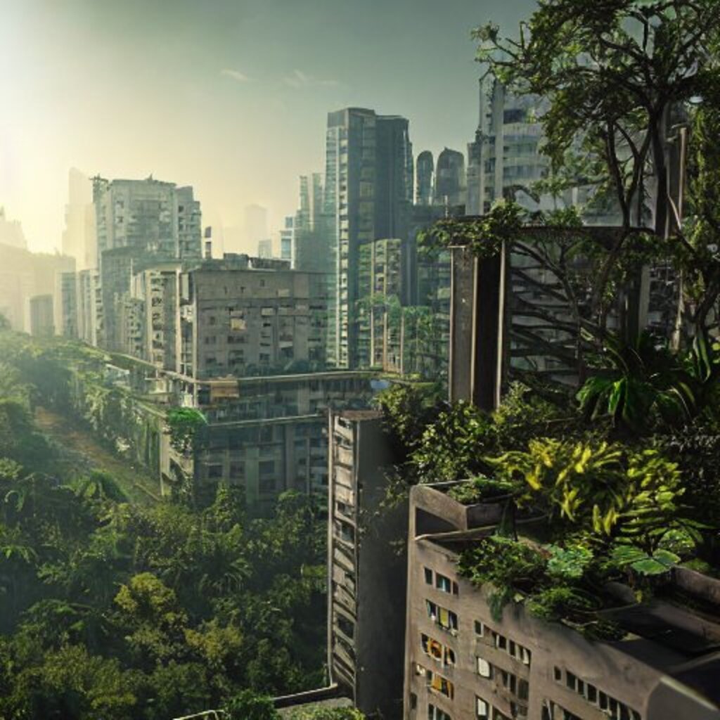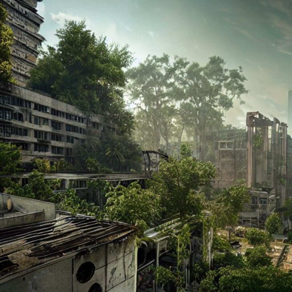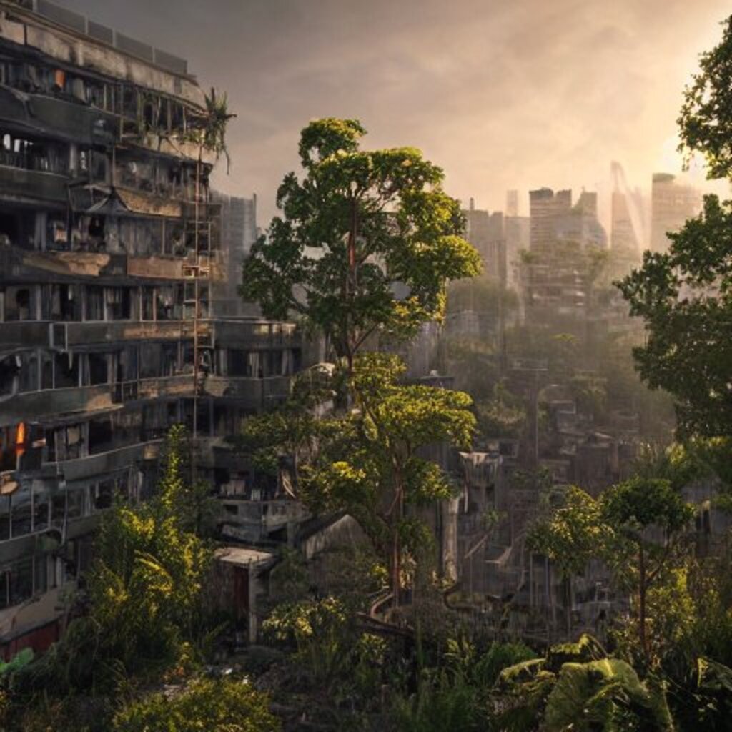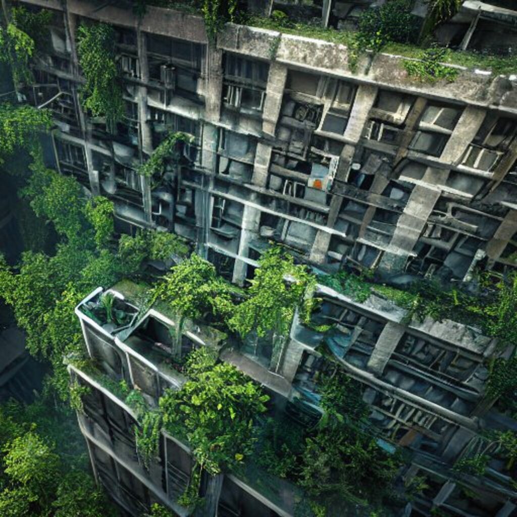 watching down from a rooftop to the overgrown abandoned ruins of mega city, toxic air, green sunset, green plant and trees, corona render, matte painting, god rays volume light, 4k, hyperrealistic, focused, 8 k, high details, unreal engine 5, cinematic, masterpiece