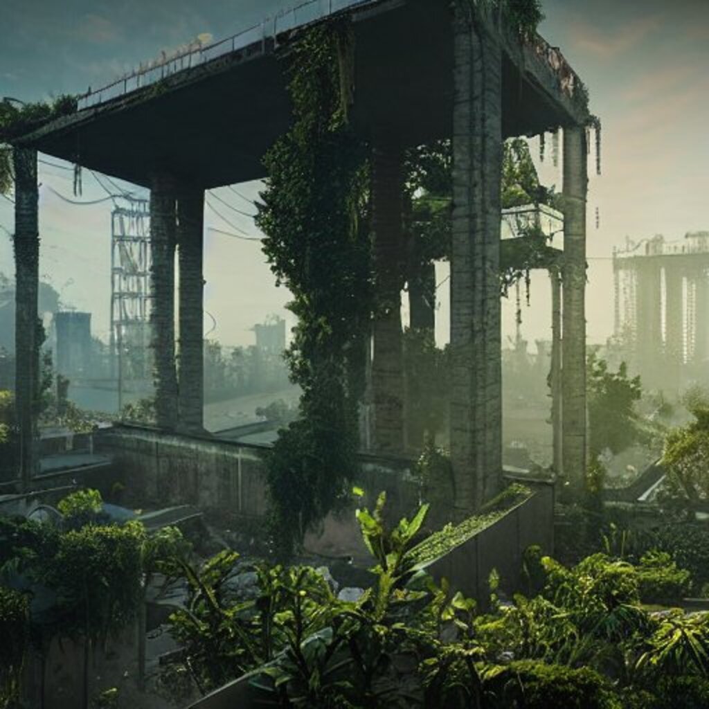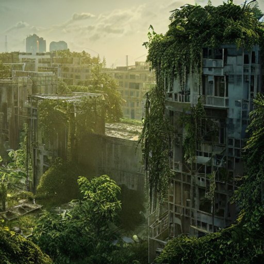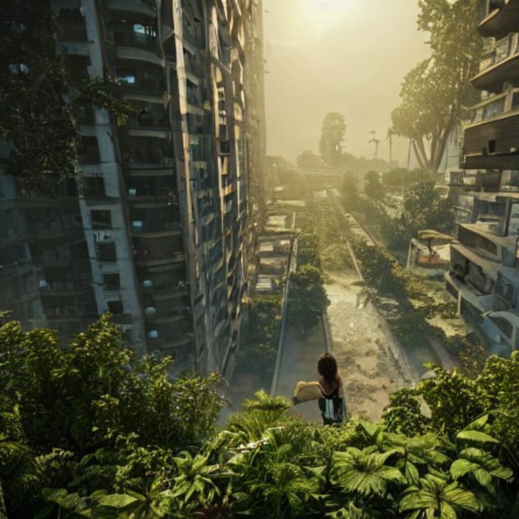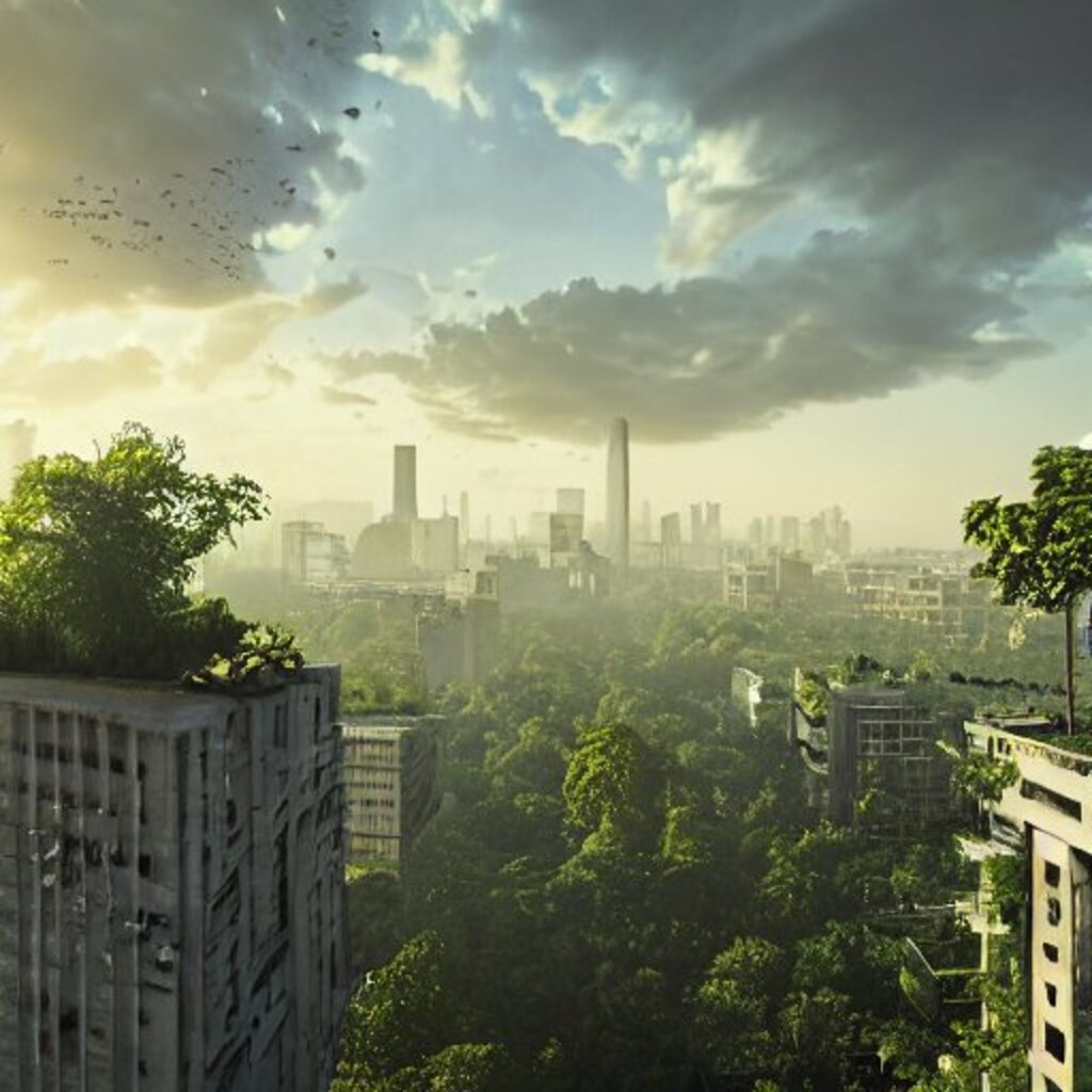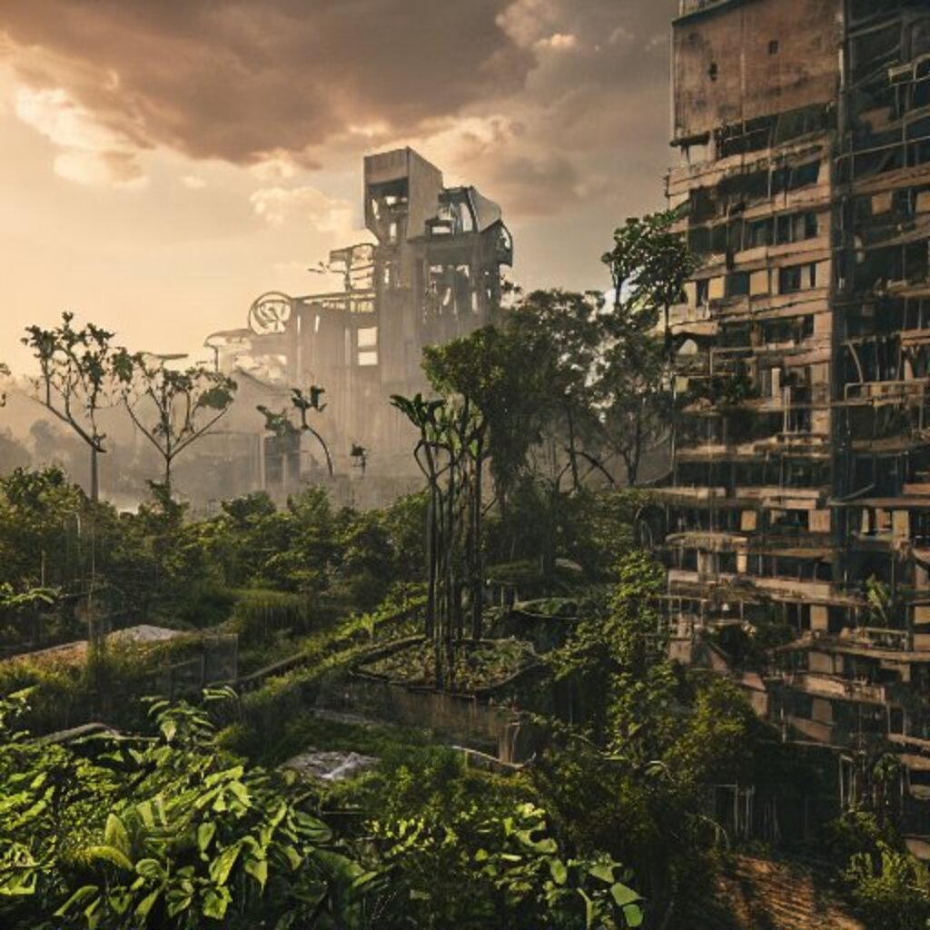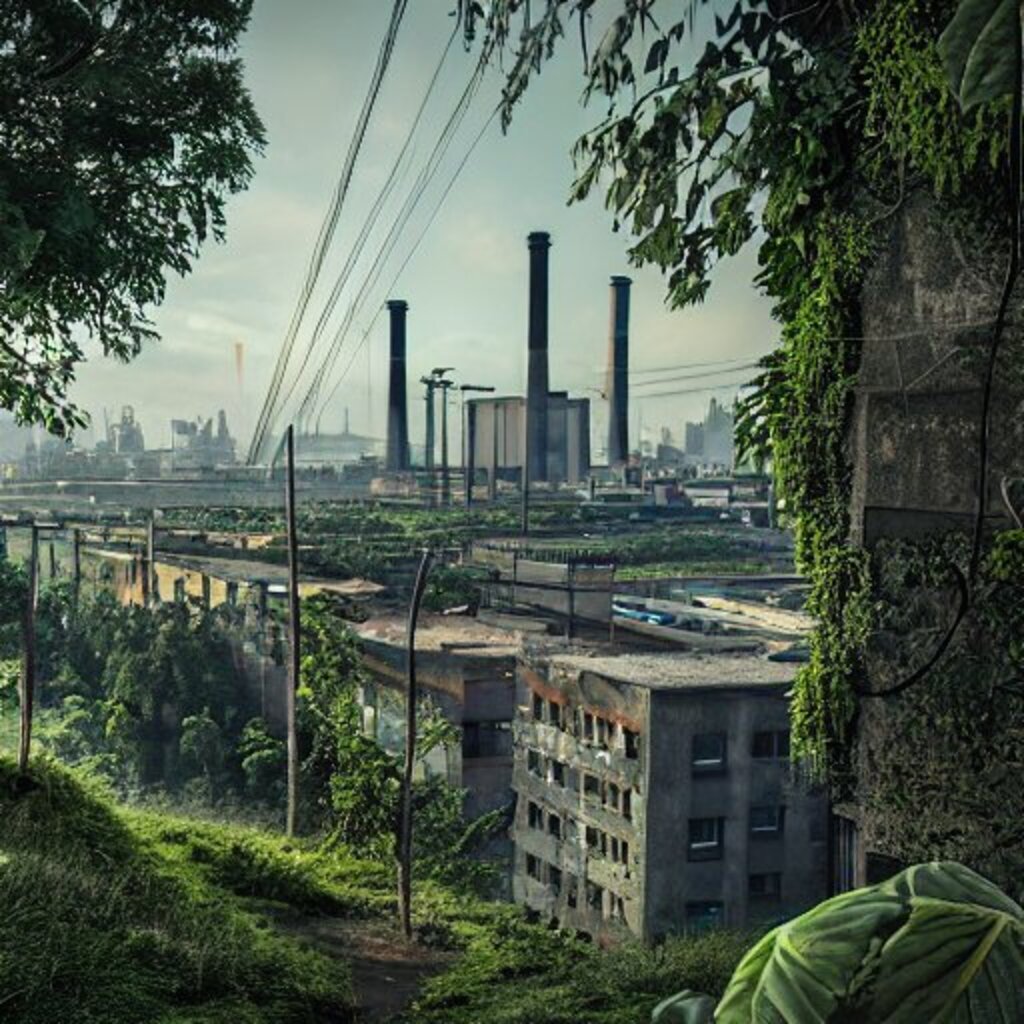watching down from a rooftop to the overgrown abandoned ruins of mega city, toxic air, green sunset, green plant and trees, corona render, matte painting, god rays volume light, 4k, hyperrealistic, focused, 8 k, high details, unreal engine 5, cinematic, masterpiece