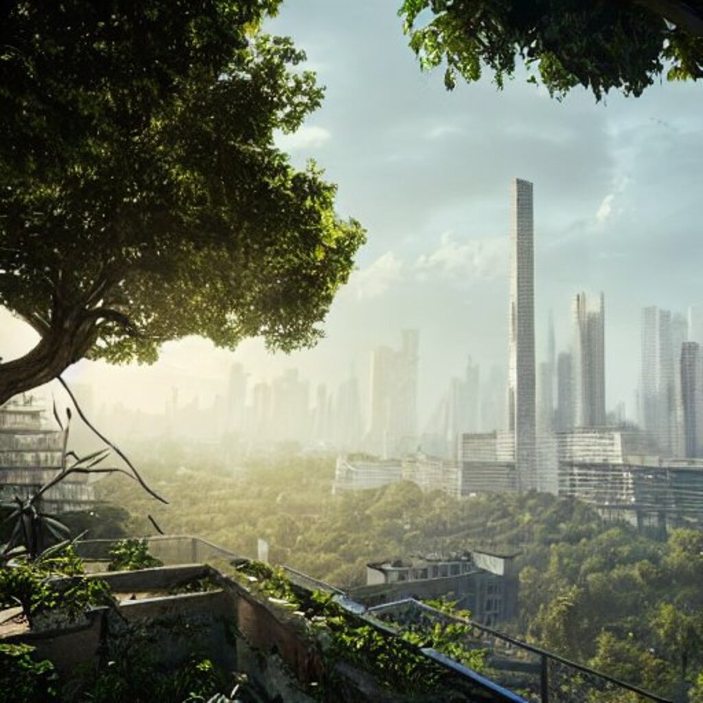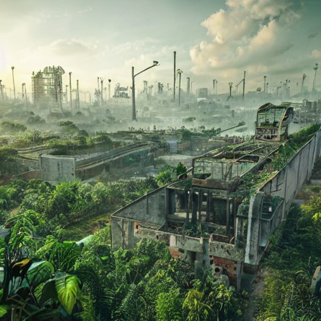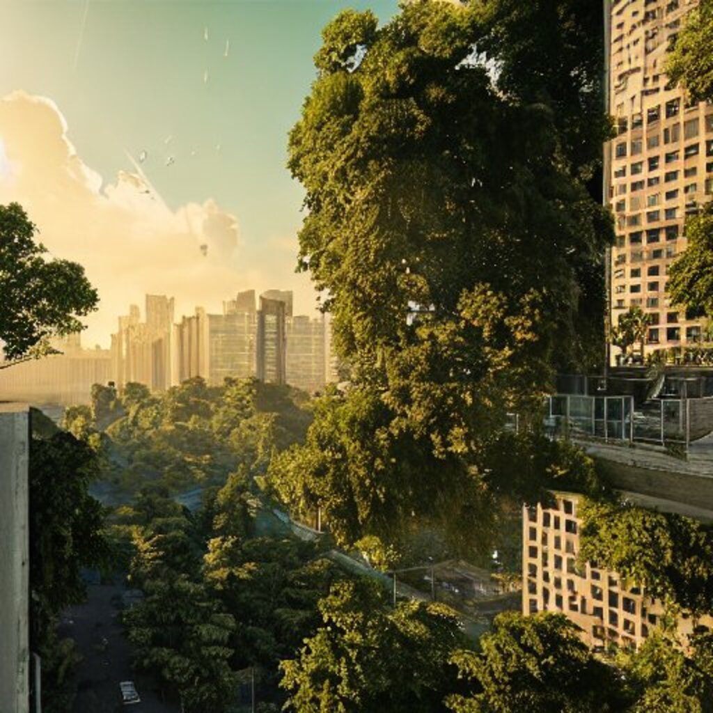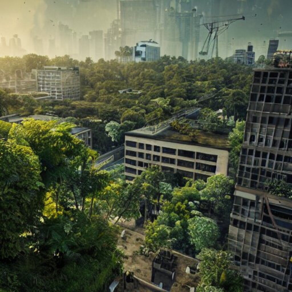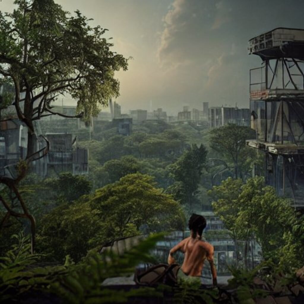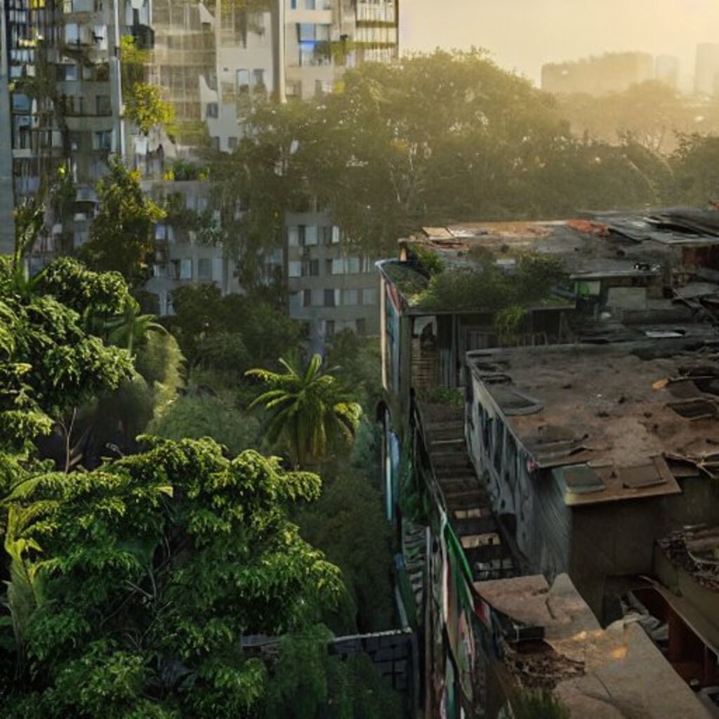 watching down from a rooftop to the overgrown abandoned ruins of mega city, toxic air, green sunset, green plant and trees, corona render, matte painting, god rays volume light, 4k, hyperrealistic, focused, 8 k, high details, unreal engine 5, cinematic, masterpiece