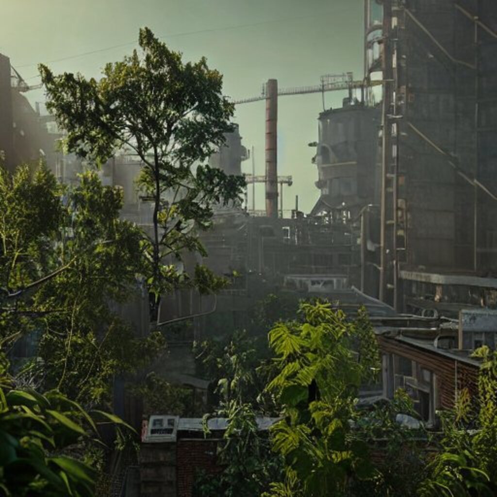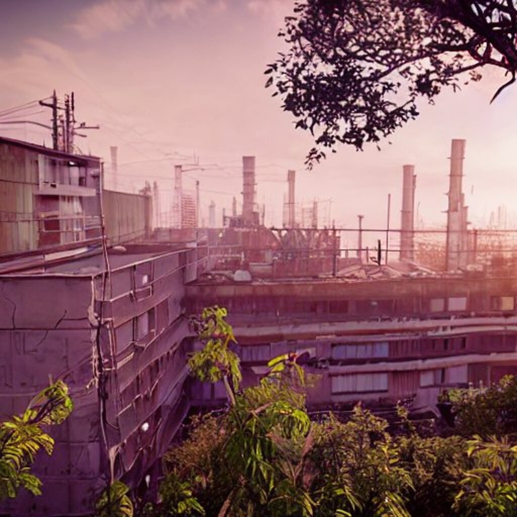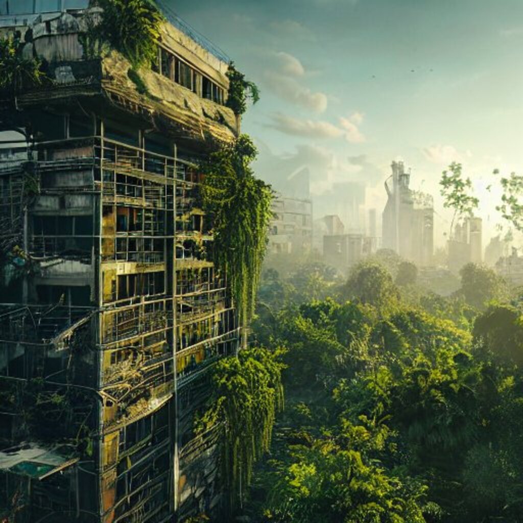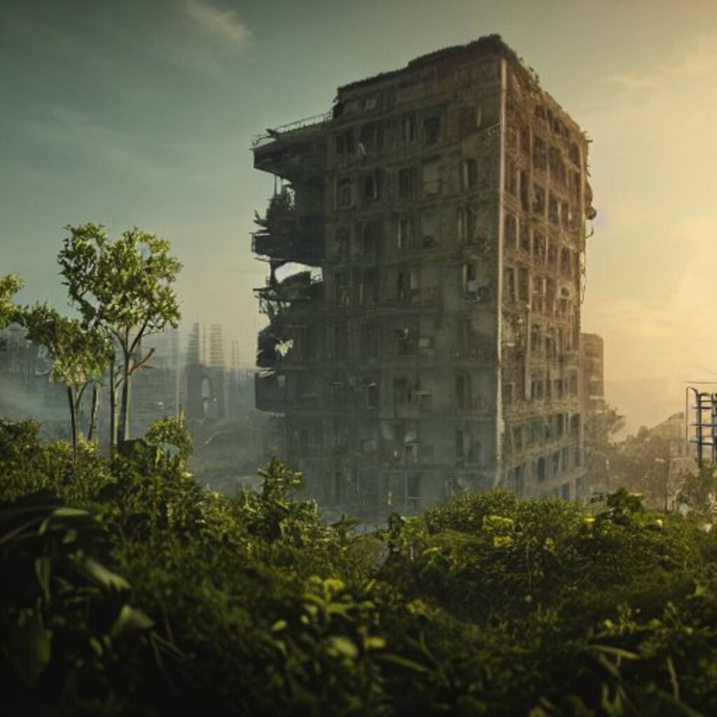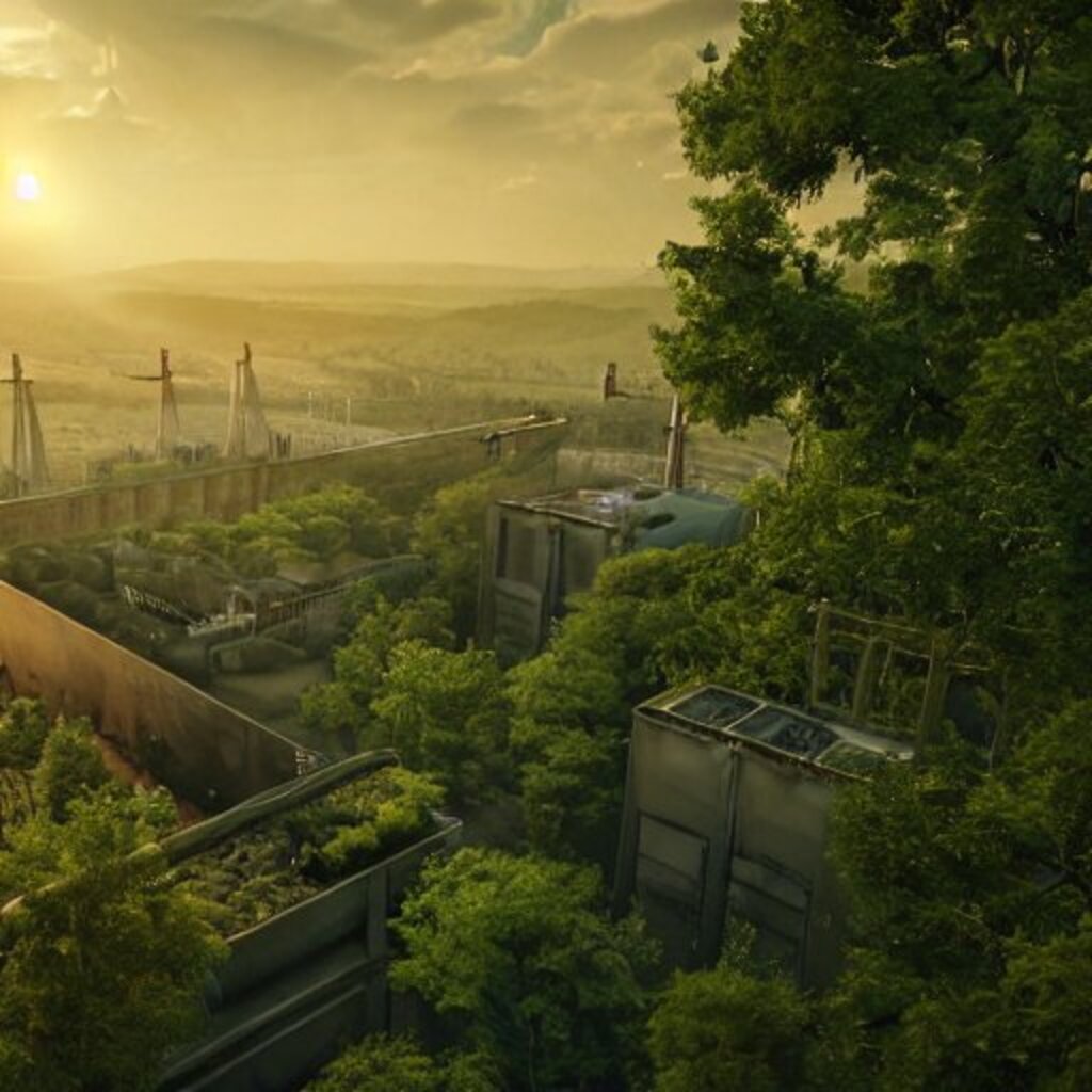 watching down from a rooftop to the overgrown abandoned ruins of mega city, toxic air, green sunset, green plant and trees, corona render, matte painting, god rays volume light, 4k, hyperrealistic, focused, 8 k, high details, unreal engine 5, cinematic, masterpiece