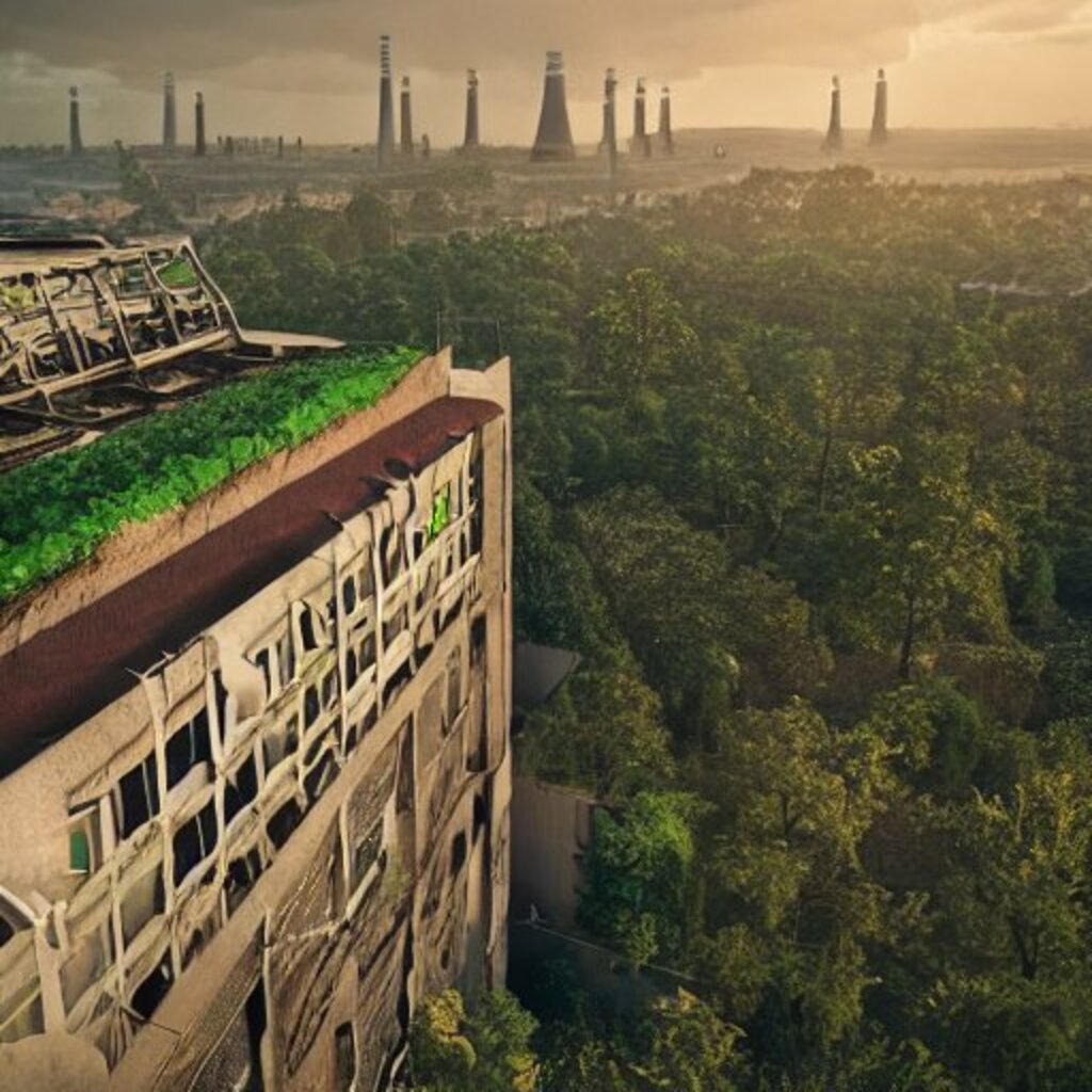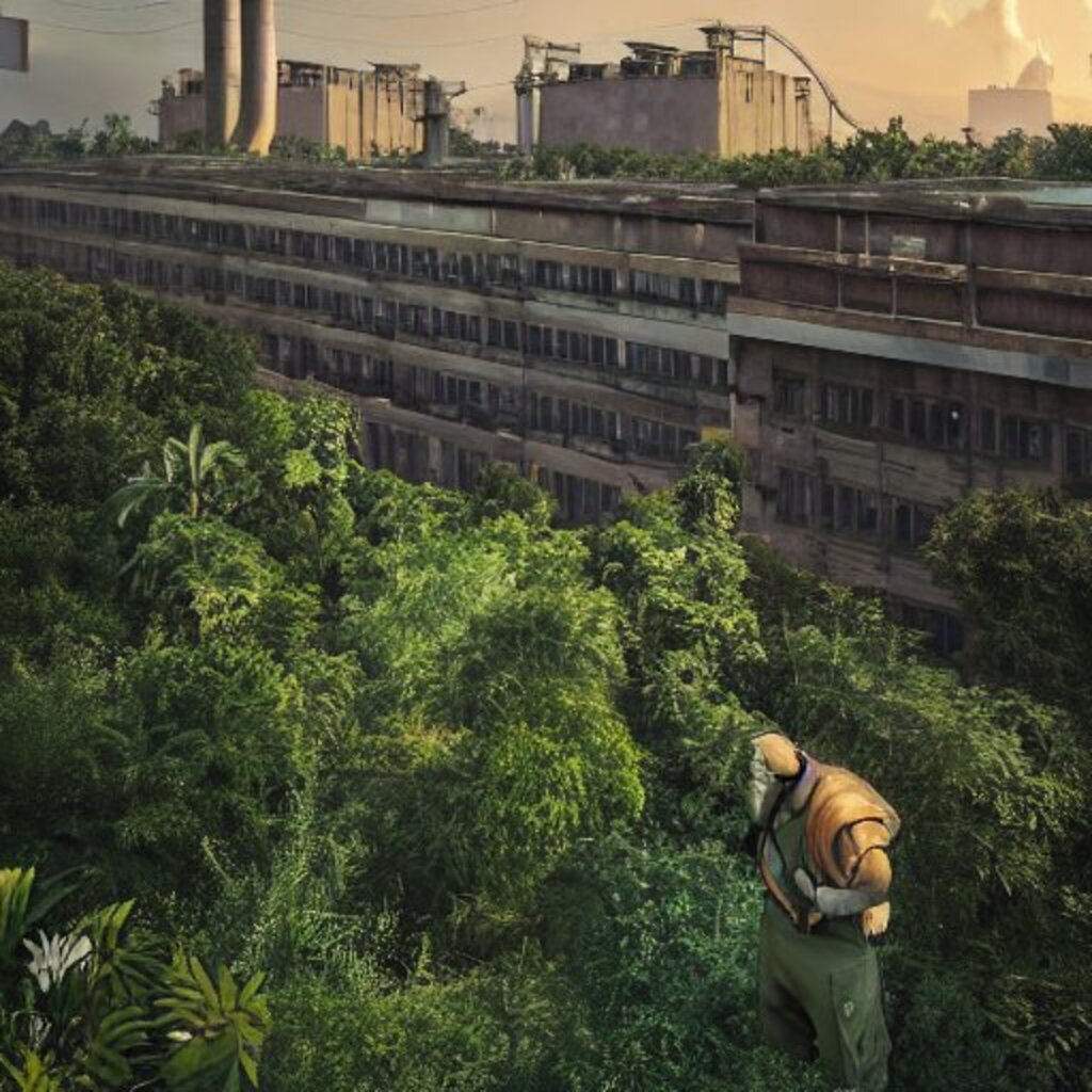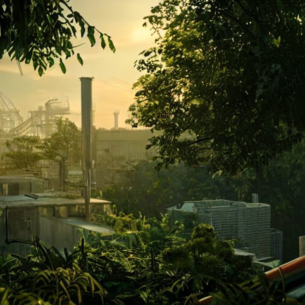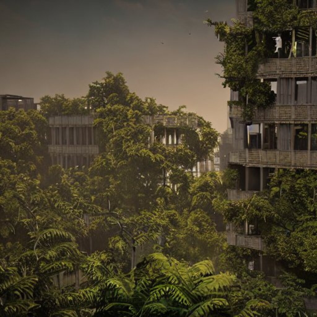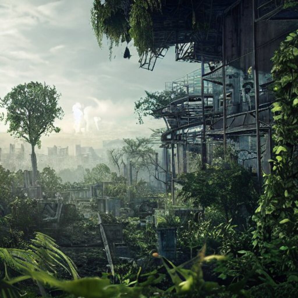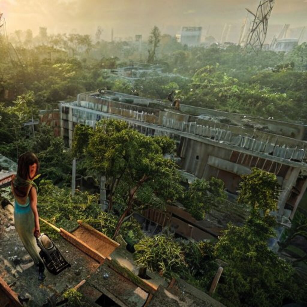 watching down from a rooftop to the overgrown abandoned ruins of mega city, toxic air, green sunset, green plant and trees, corona render, matte painting, god rays volume light, 4k, hyperrealistic, focused, 8 k, high details, unreal engine 5, cinematic, masterpiece