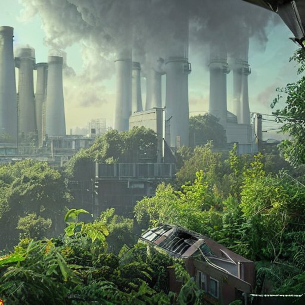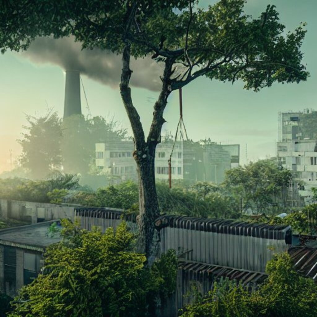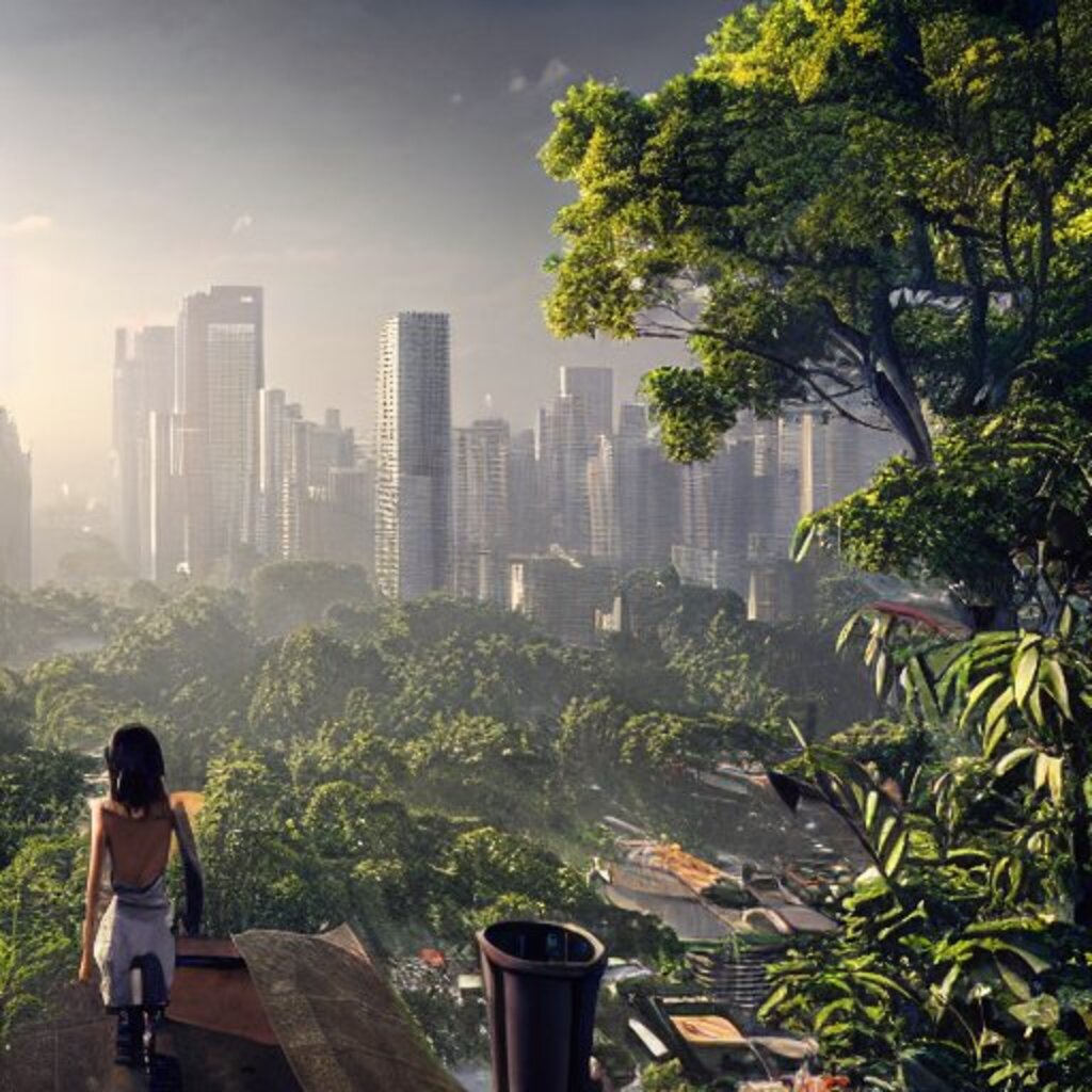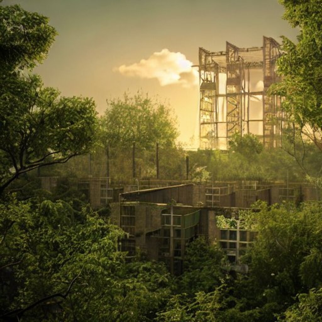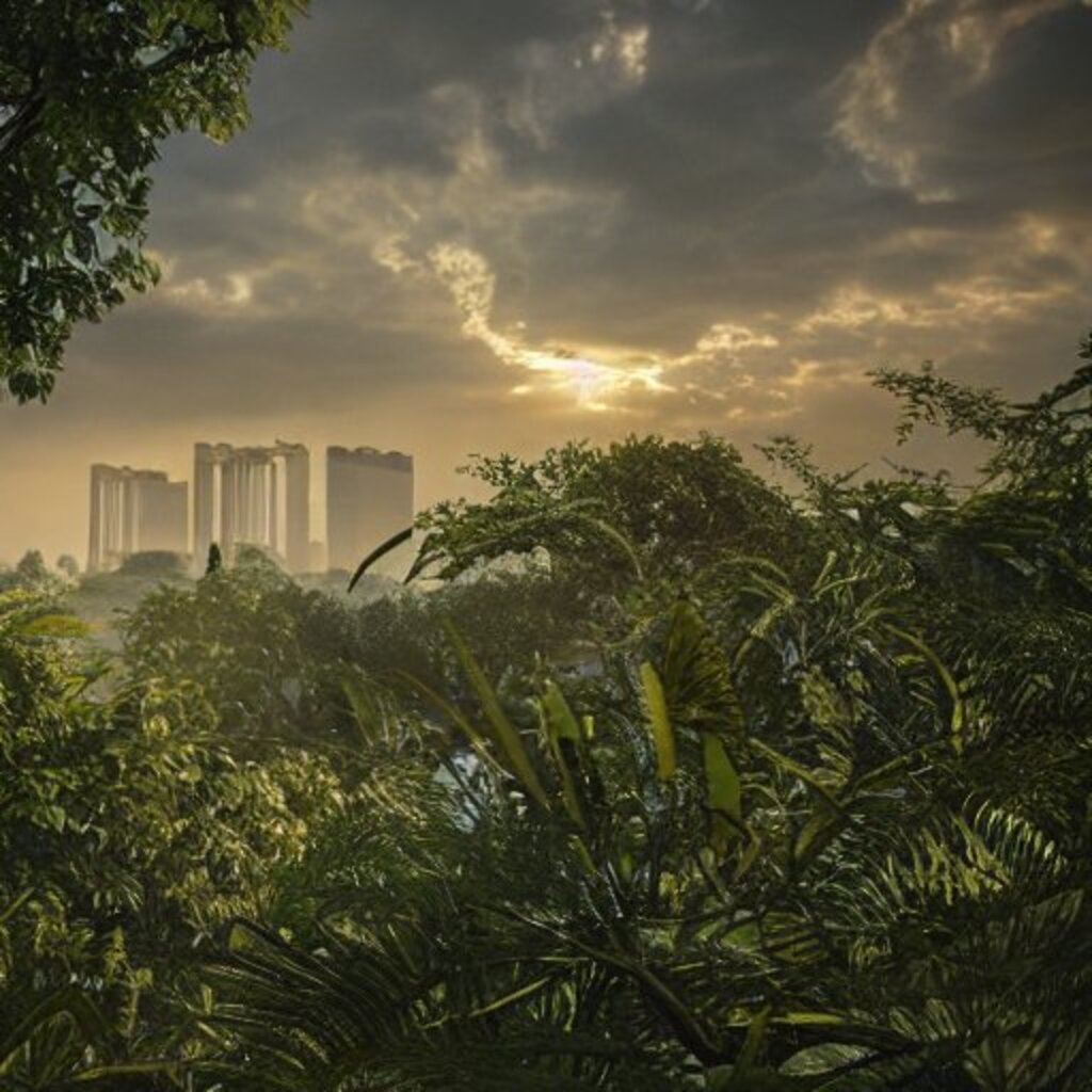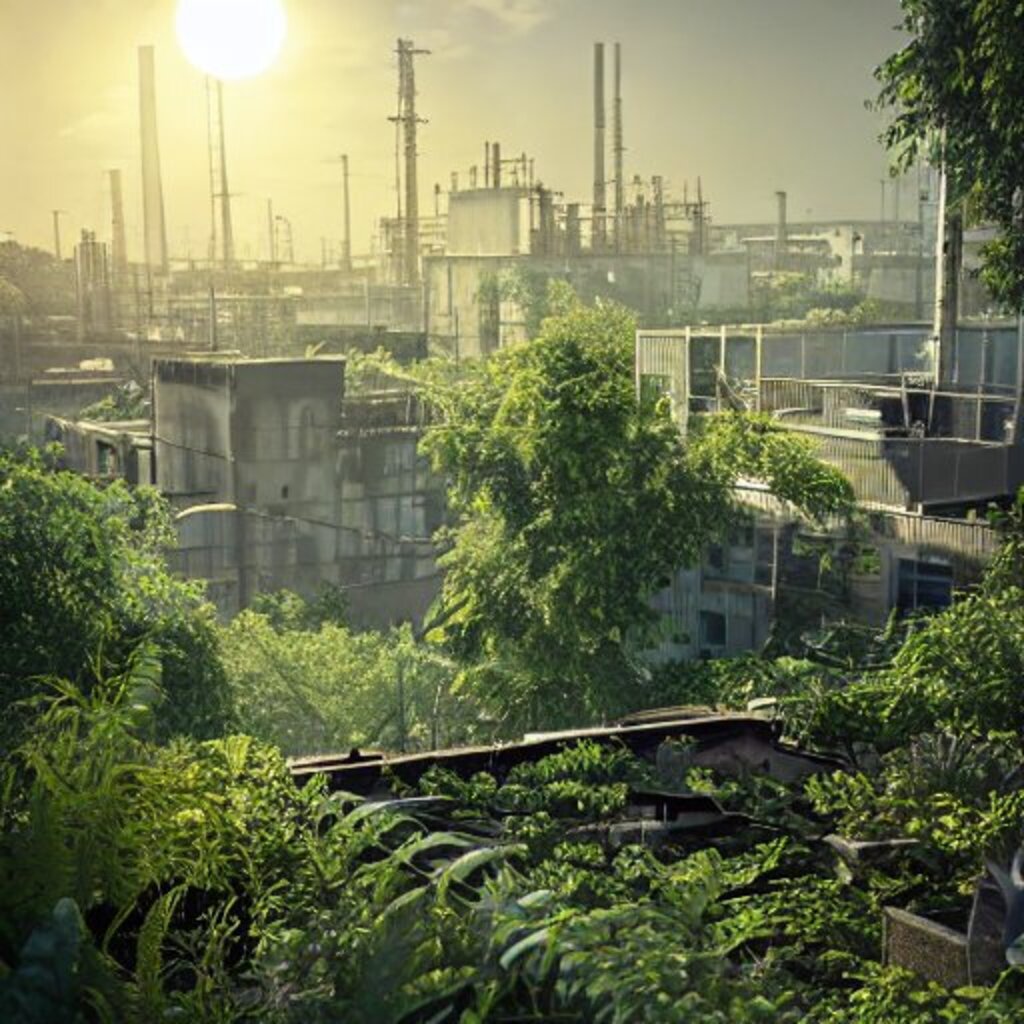 watching down from a rooftop to the overgrown abandoned ruins of mega city, toxic air, green sunset, green plant and trees, corona render, matte painting, god rays volume light, 4k, hyperrealistic, focused, 8 k, high details, unreal engine 5, cinematic, masterpiece