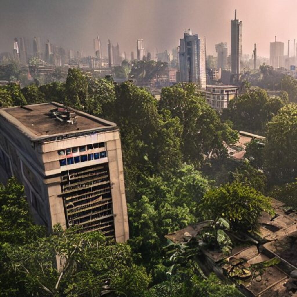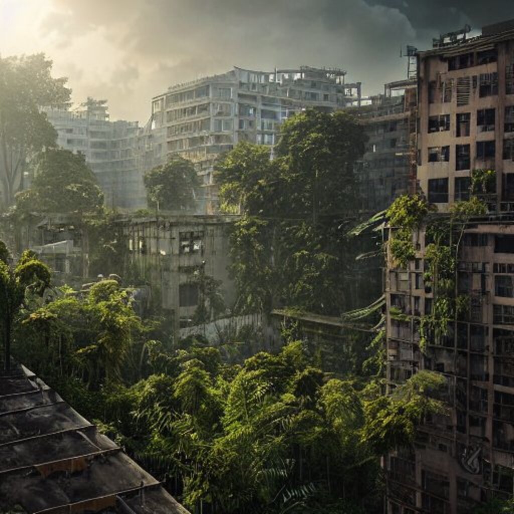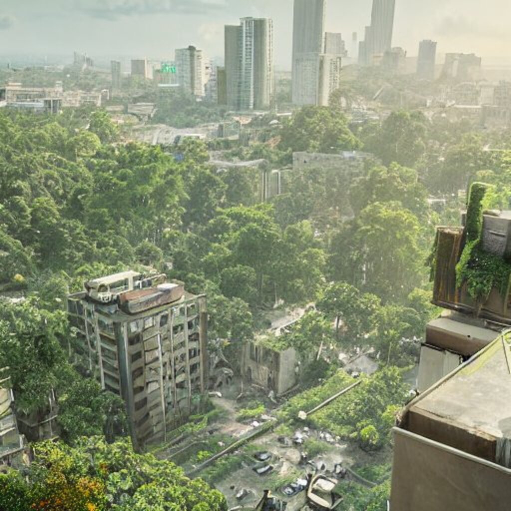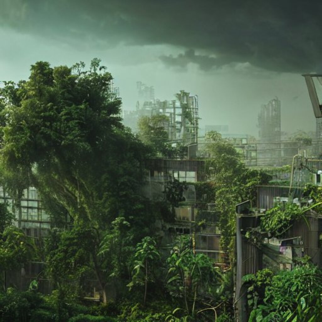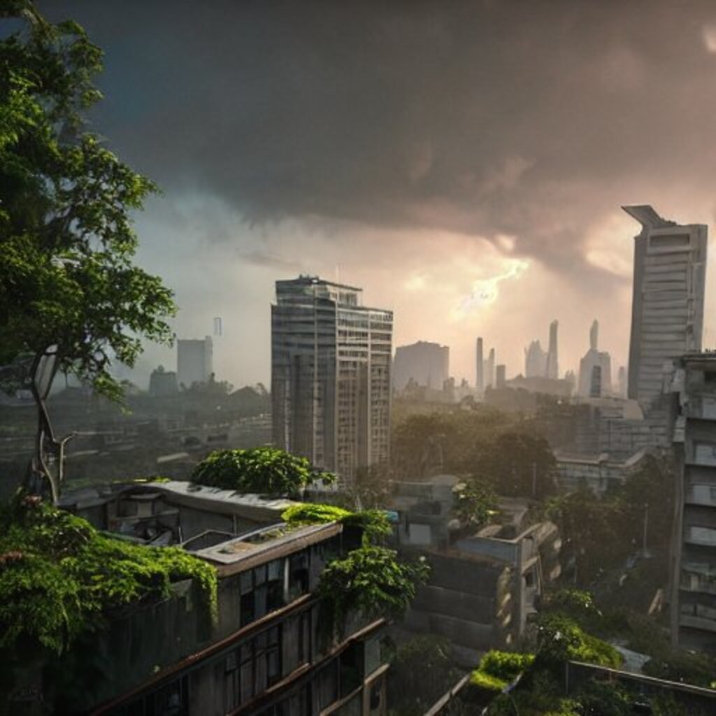 View to a road, surrounded by overgrown, abandoned ruins, green plant and trees. Heavy rain and a grey sky with dark clouds and a lightning to a skyscraper.