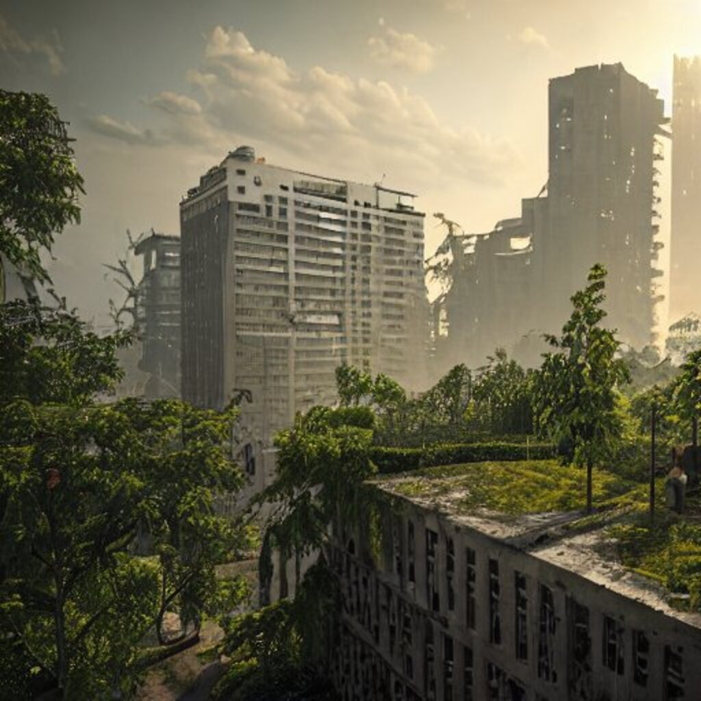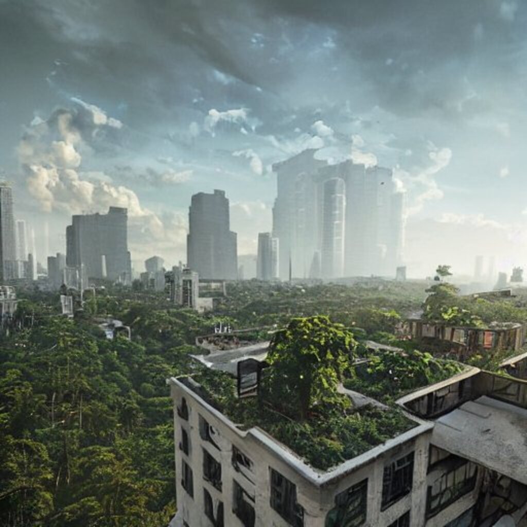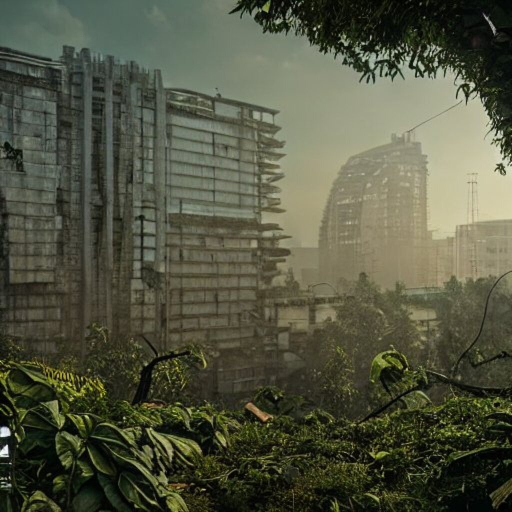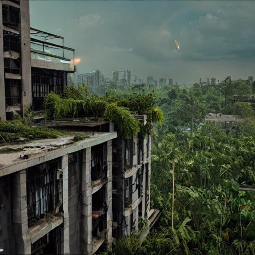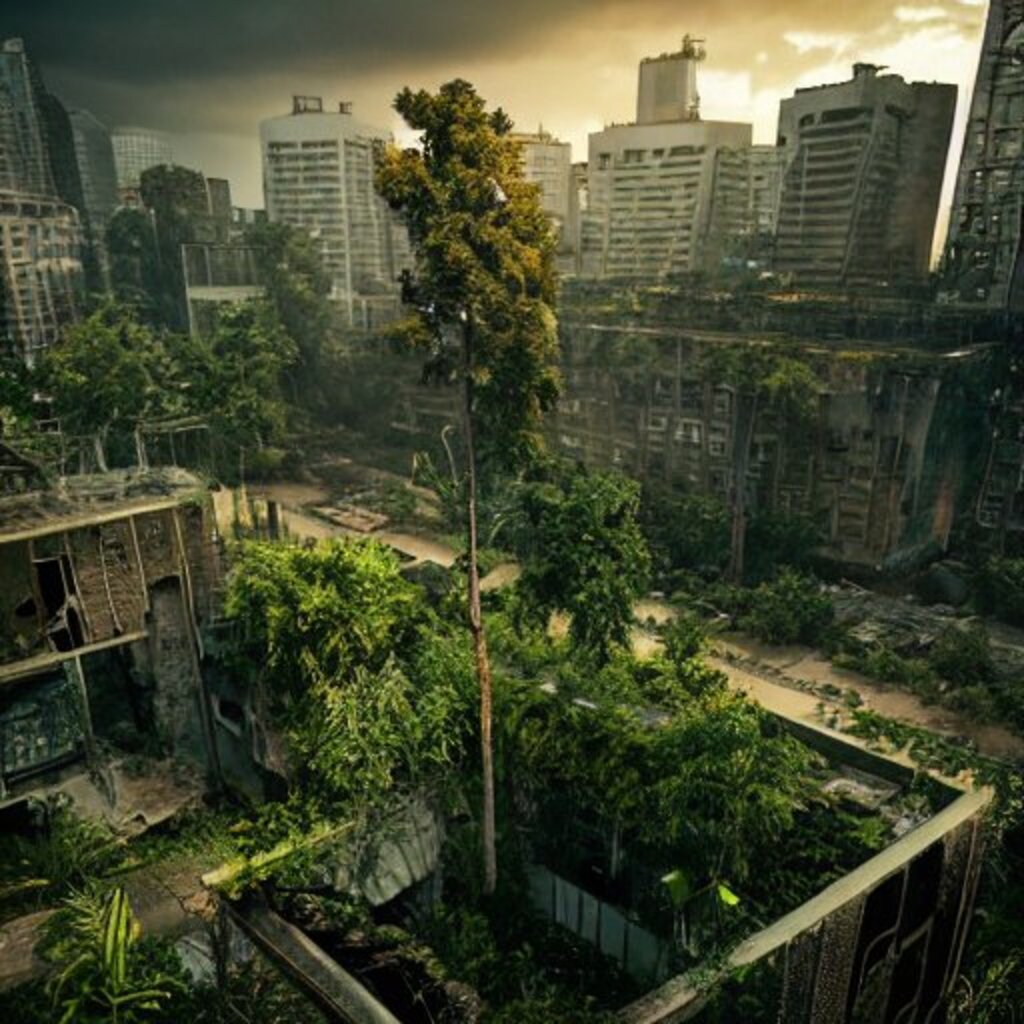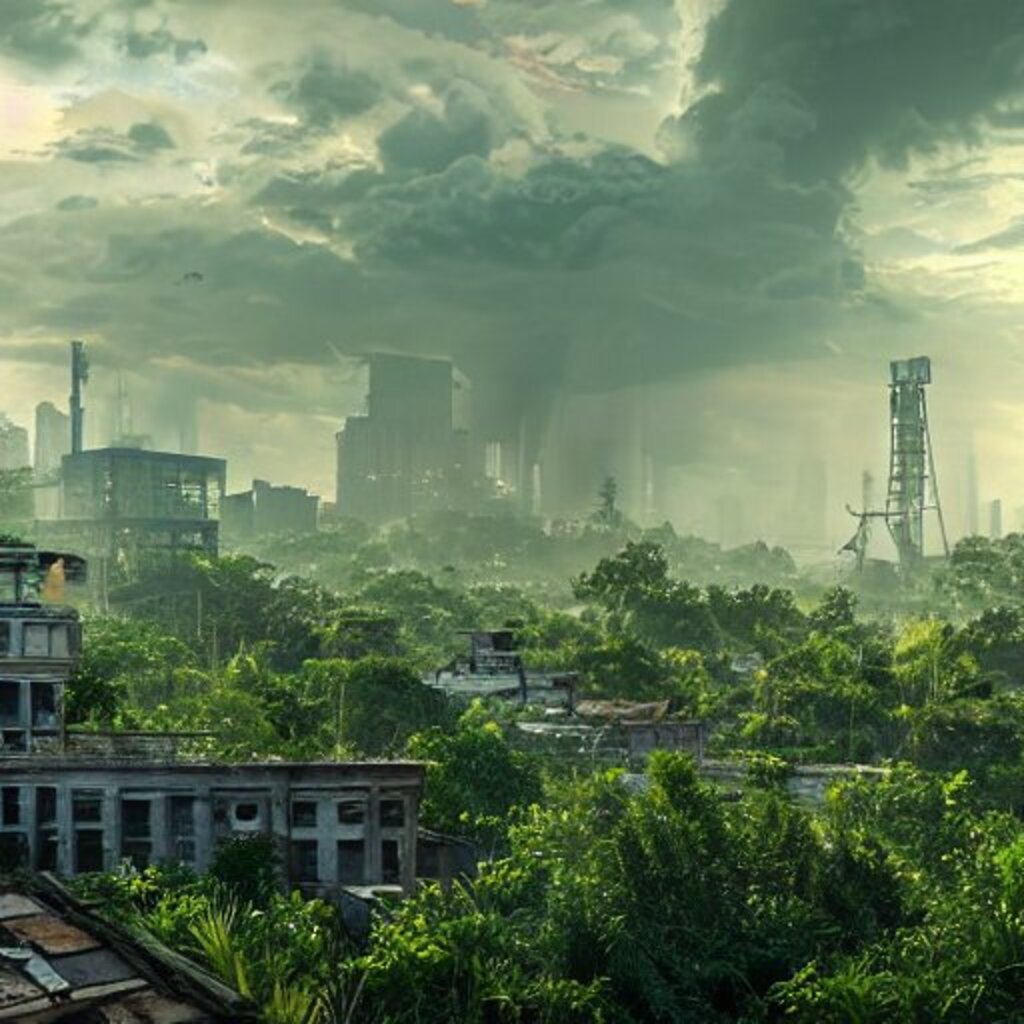 View to a road, surrounded by overgrown, abandoned ruins, green plant and trees. Heavy rain and a grey sky with dark clouds and a lightning to a skyscraper.