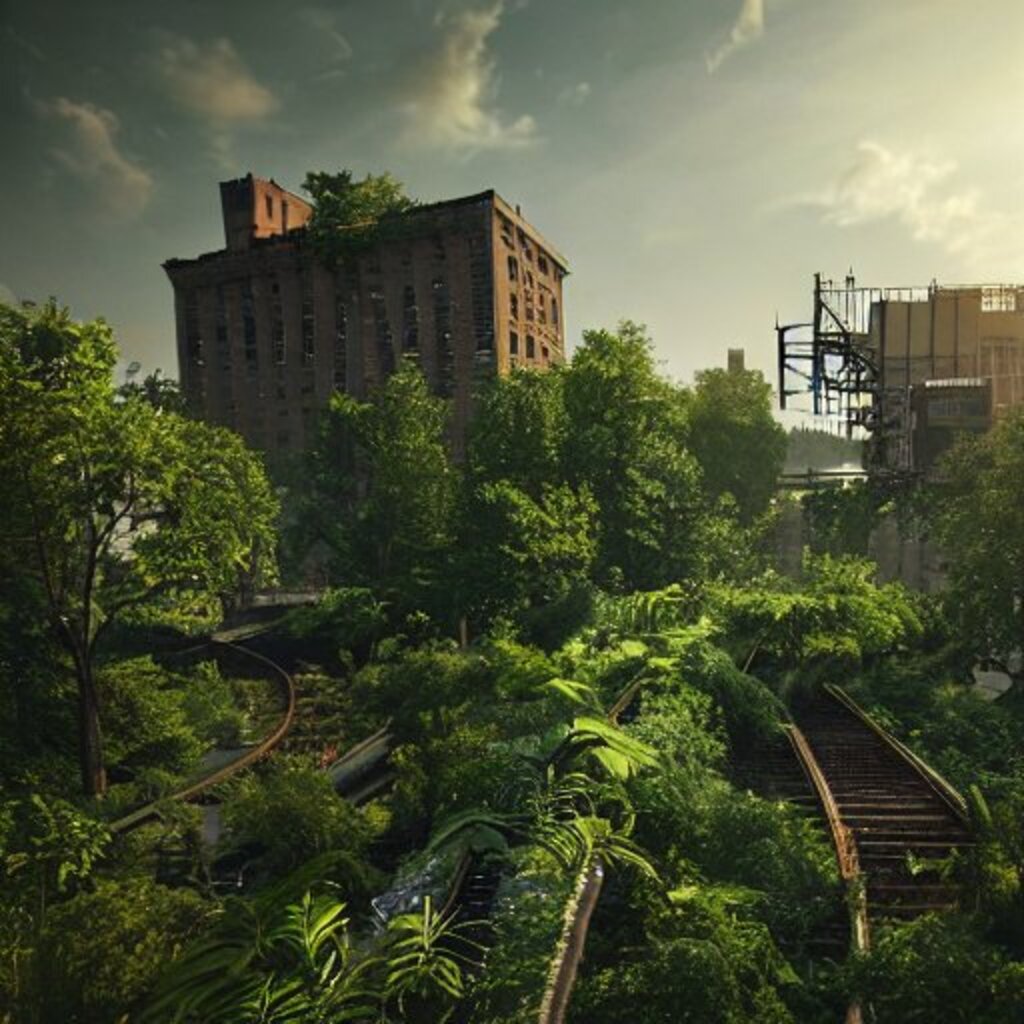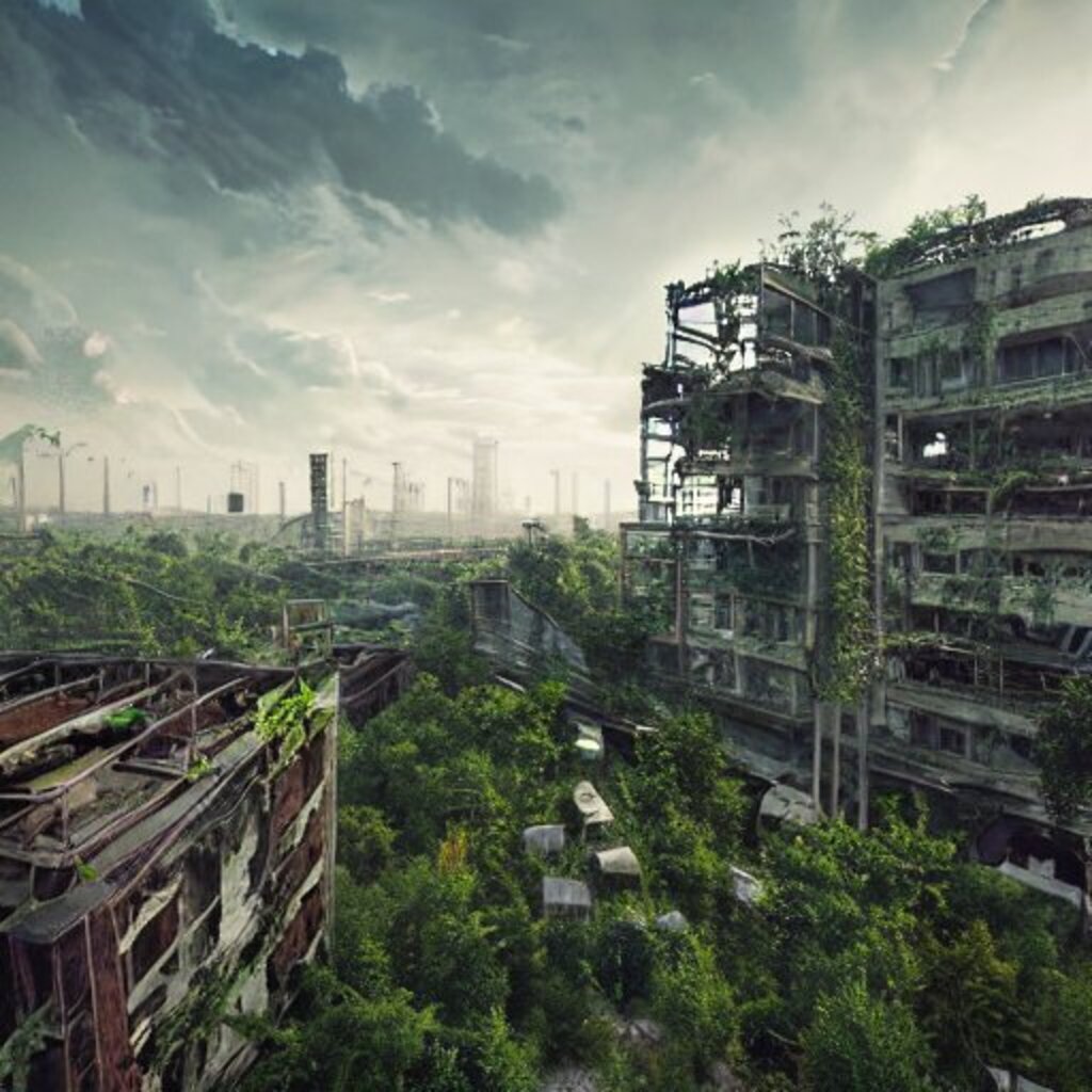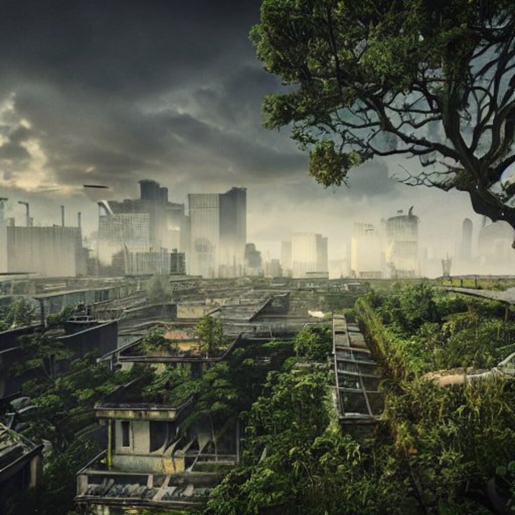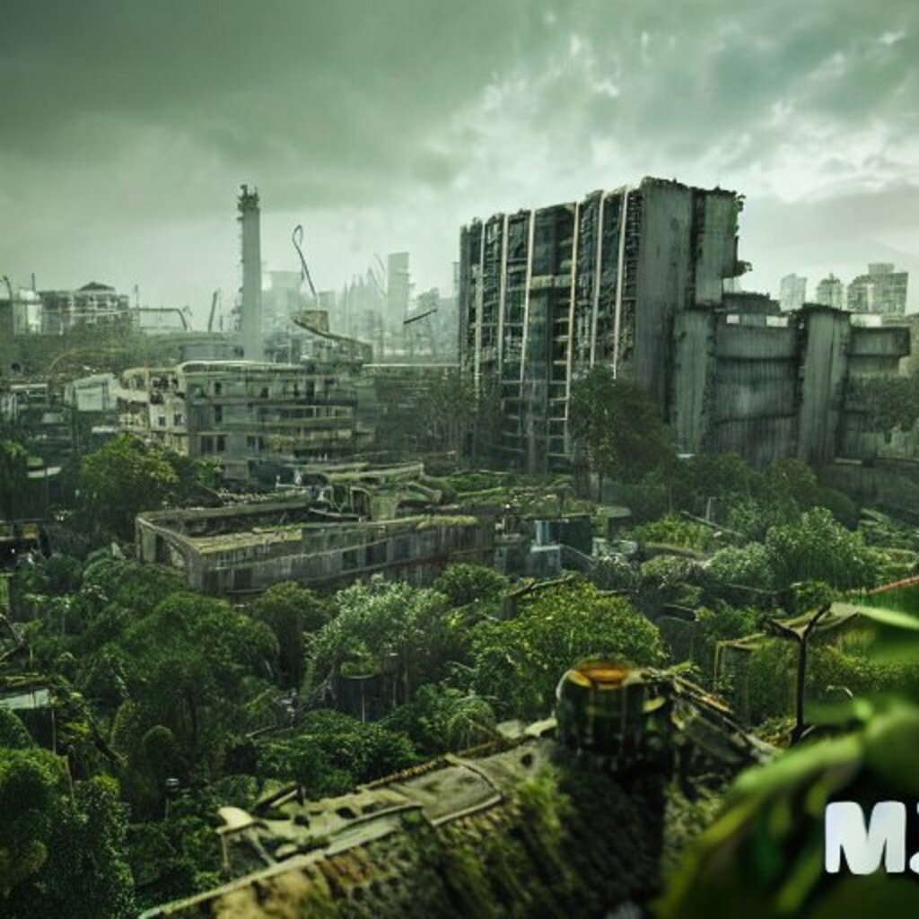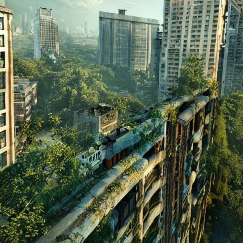 View to a road, surrounded by overgrown, abandoned ruins, green plant and trees. Heavy rain and a grey sky with dark clouds and a lightning to a skyscraper.