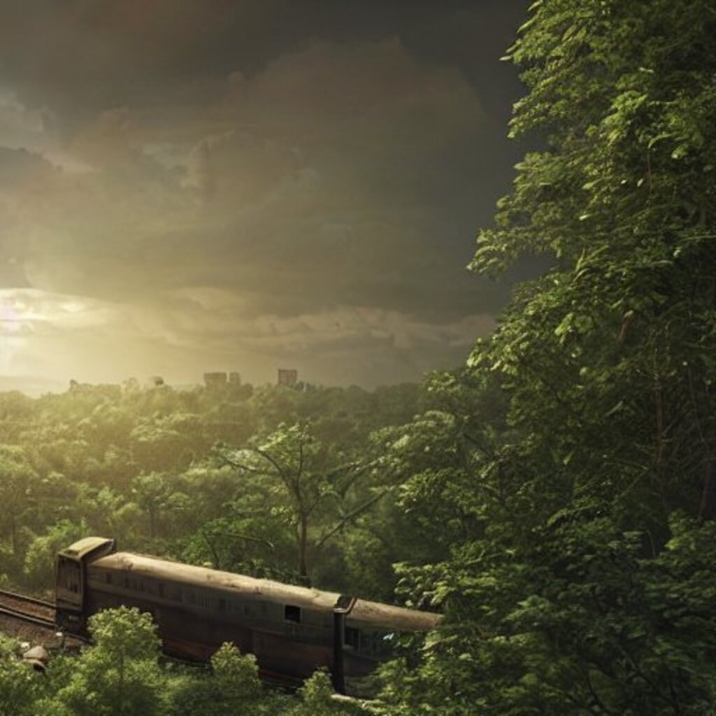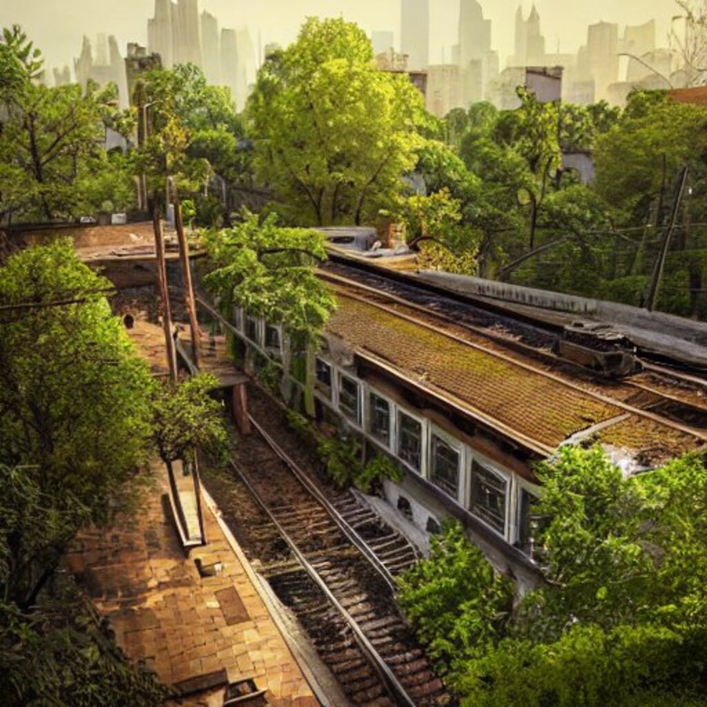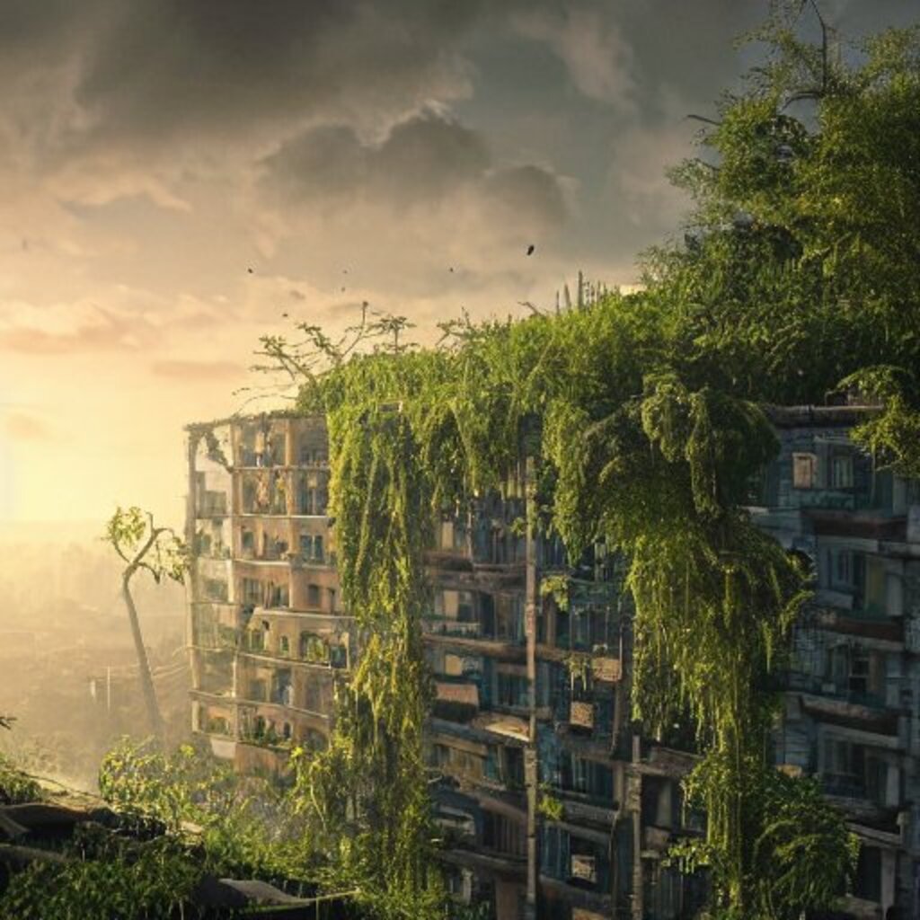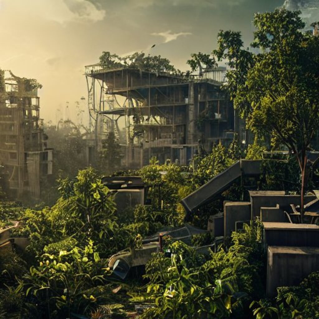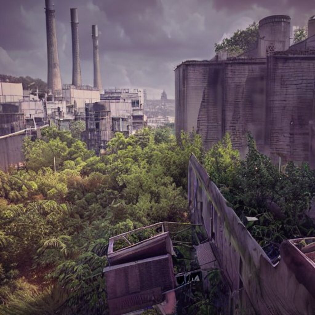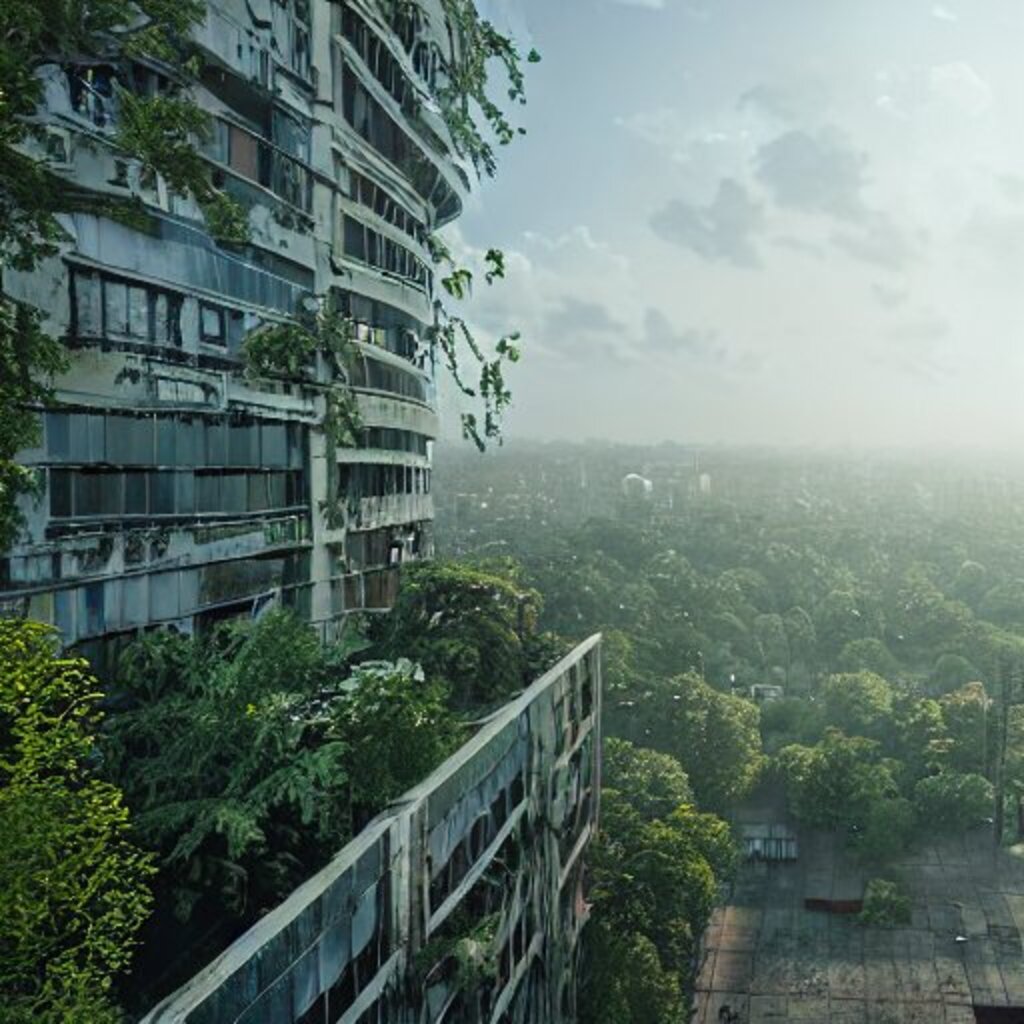 View to a road, surrounded by overgrown, abandoned ruins, green plant and trees. Heavy rain and a grey sky with dark clouds and a lightning to a skyscraper.