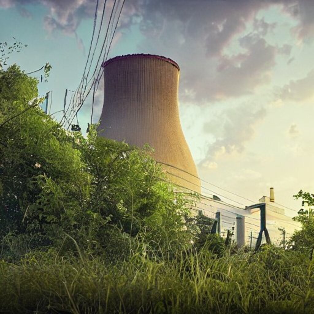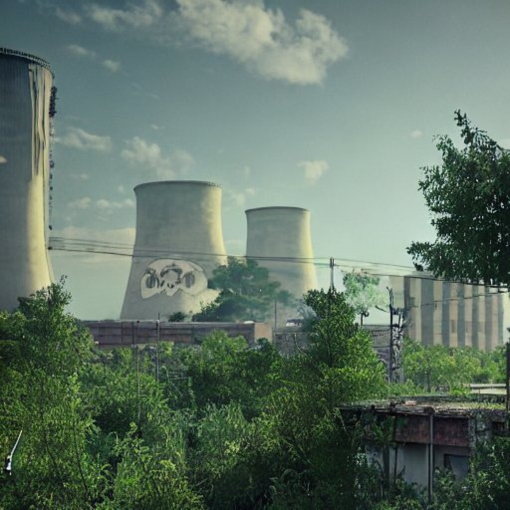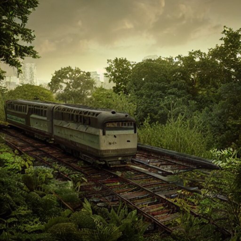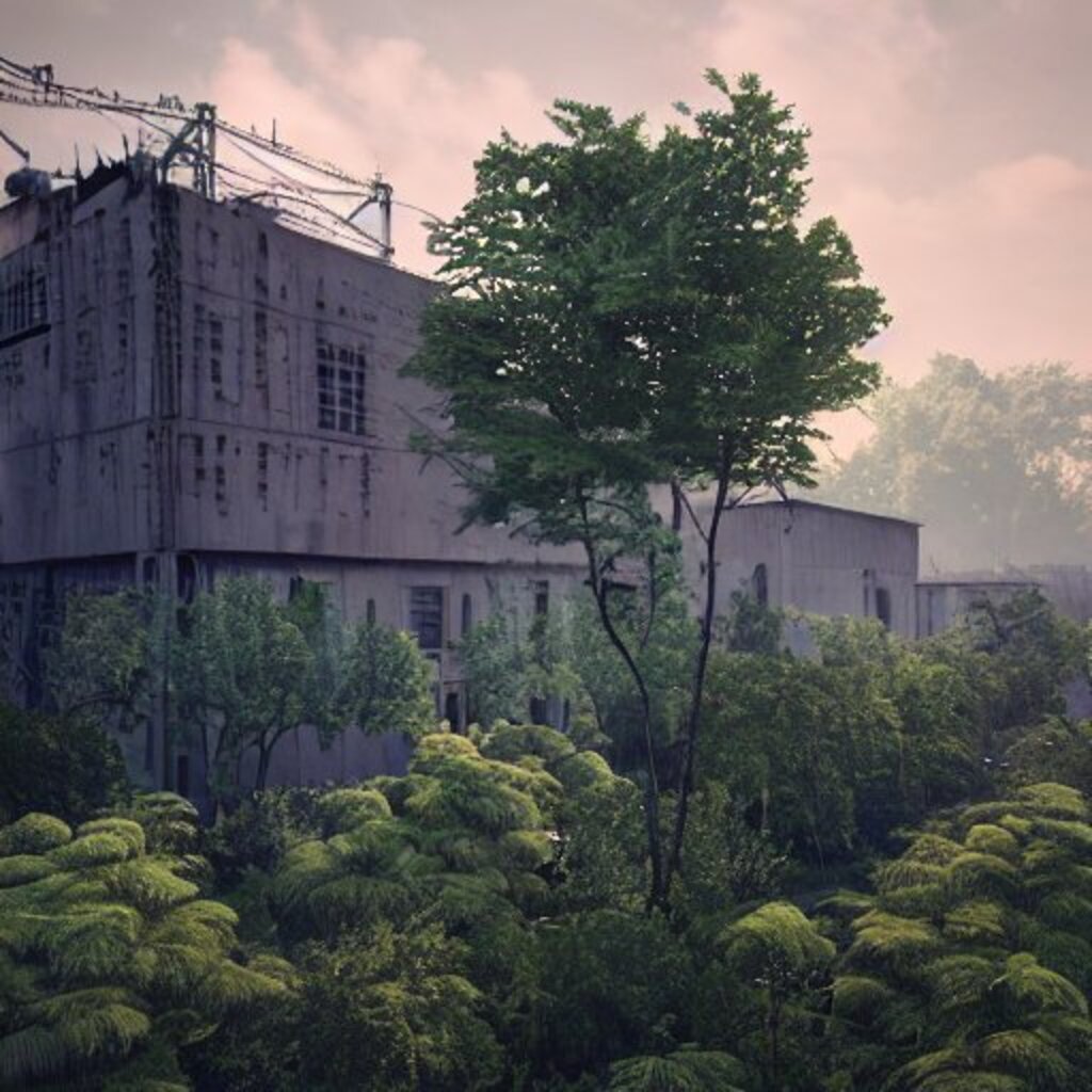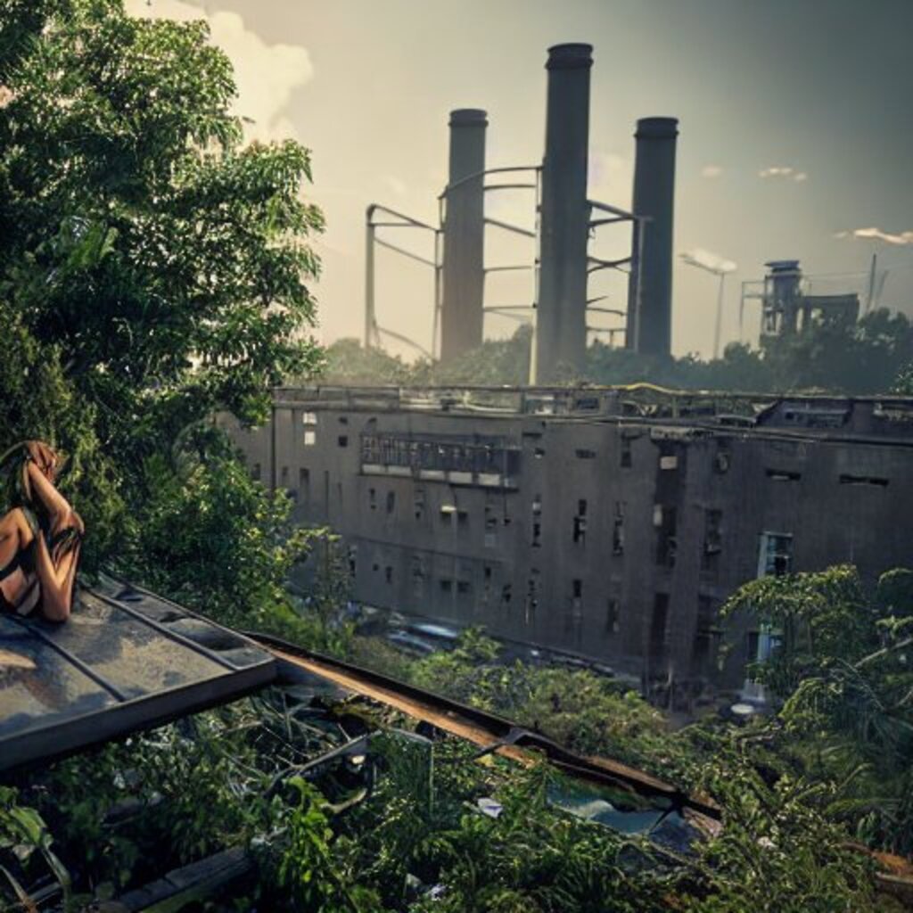 View to a road, surrounded by overgrown, abandoned ruins, green plant and trees. Heavy rain and a grey sky with dark clouds and a lightning to a skyscraper.